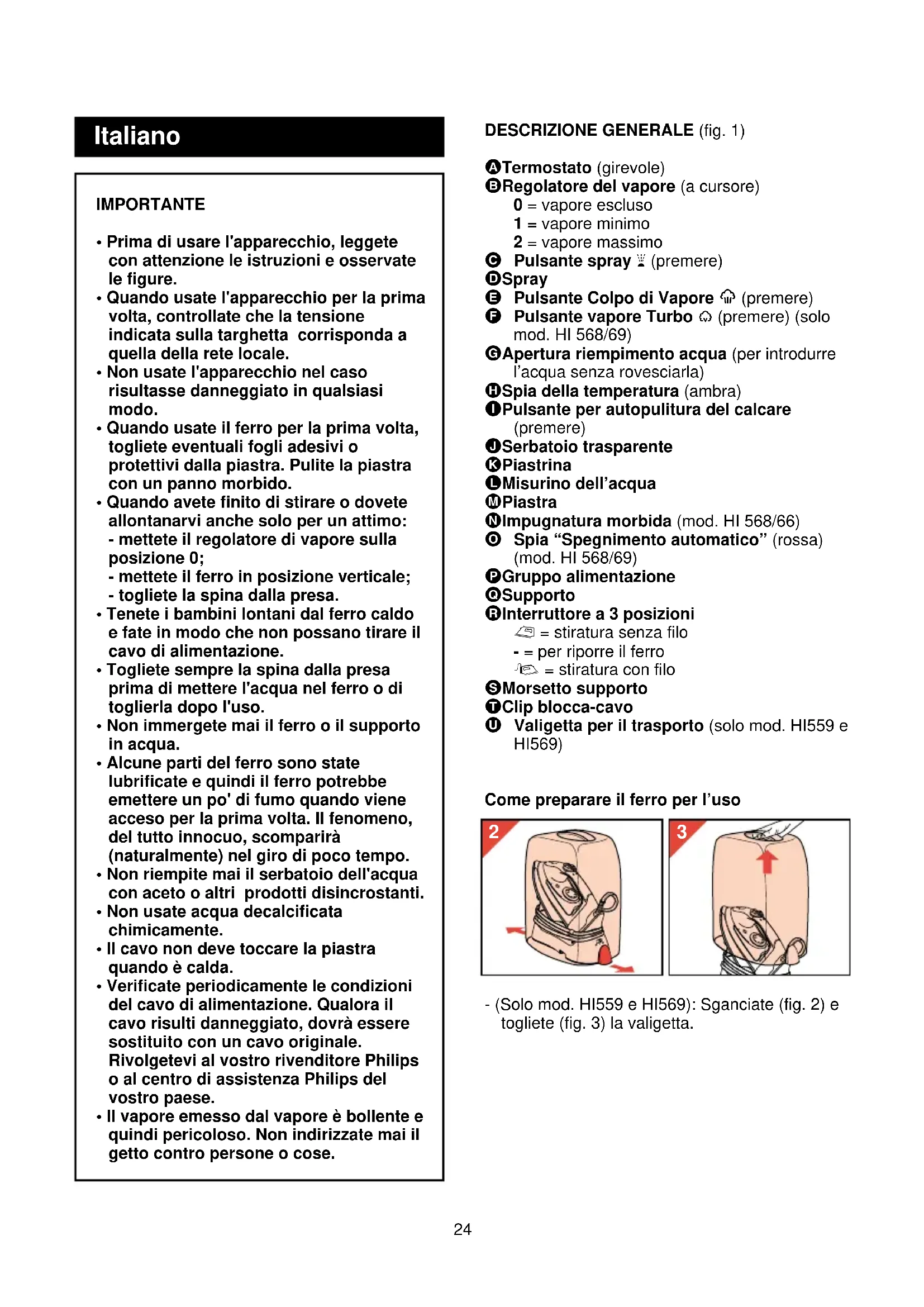 CLICKItaliano DESCRIZIONE GENERALE (fig. 1) A Termostato (girevole) B Regolatore del vapore (a cursore) 0 = vapore escluso 1 = vapore minimo 2 = vapore massimo C Pulsante spray T (premere) D Spray E Pulsante Colpo di Vapore 9 (premere) F Pulsante vapore Turbo 0 (premere) (solo mod. HI 568/69) G Apertura riempimento acqua (per introdurre l’acqua senza rovesciarla) H Spia della temperatura (ambra) I Pulsante per autopulitura del calcare (premere) J Serbatoio trasparente K Piastrina L Misurino dell’acqua M Piastra N Impugnatura morbida (mod. HI 568/66) O Spia “Spegnimento automatico” (rossa) (mod. HI 568/69) P Gruppo alimentazione Q Supporto R Interruttore a 3 posizioni ∫ = stiratura senza filo - = per riporre il ferro ª = stiratura con filo S Morsetto supporto T Clip blocca-cavo U Valigetta per il trasporto (solo mod. HI559 e HI569) Come preparare il ferro per l’uso - (Solo mod. HI559 e HI569): Sganciate (fig. 2) e togliete (fig. 3) la valigetta. IMPORTANTE