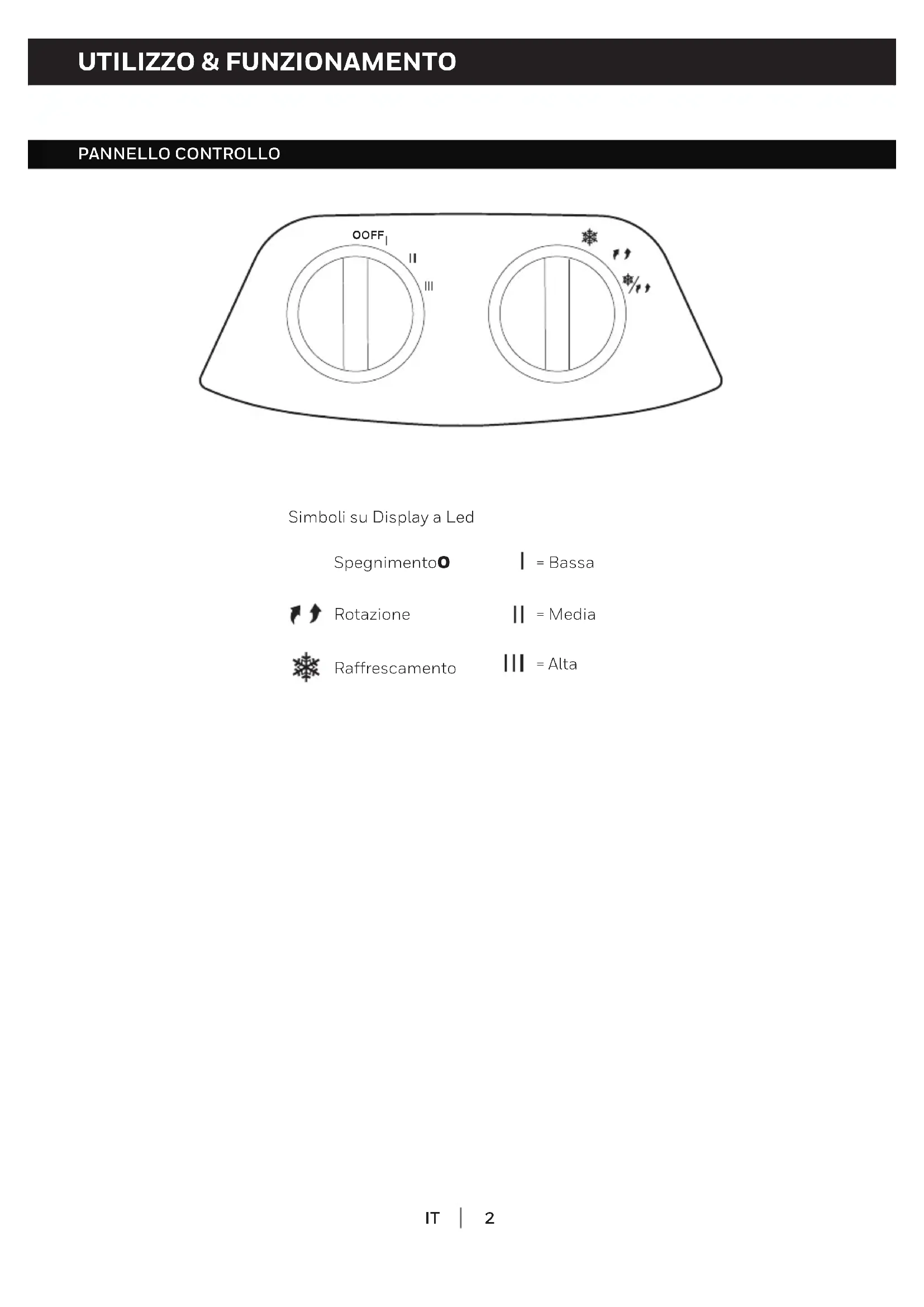 PANNELLO CONTROLLO O OFF Simboli su Display a Led Rotazione SpegnimentoO Raffrescamento = Bassa = Media = Alta3 UTILIZZO & FUNZIONAMENTO (CONTINUAZIONE)