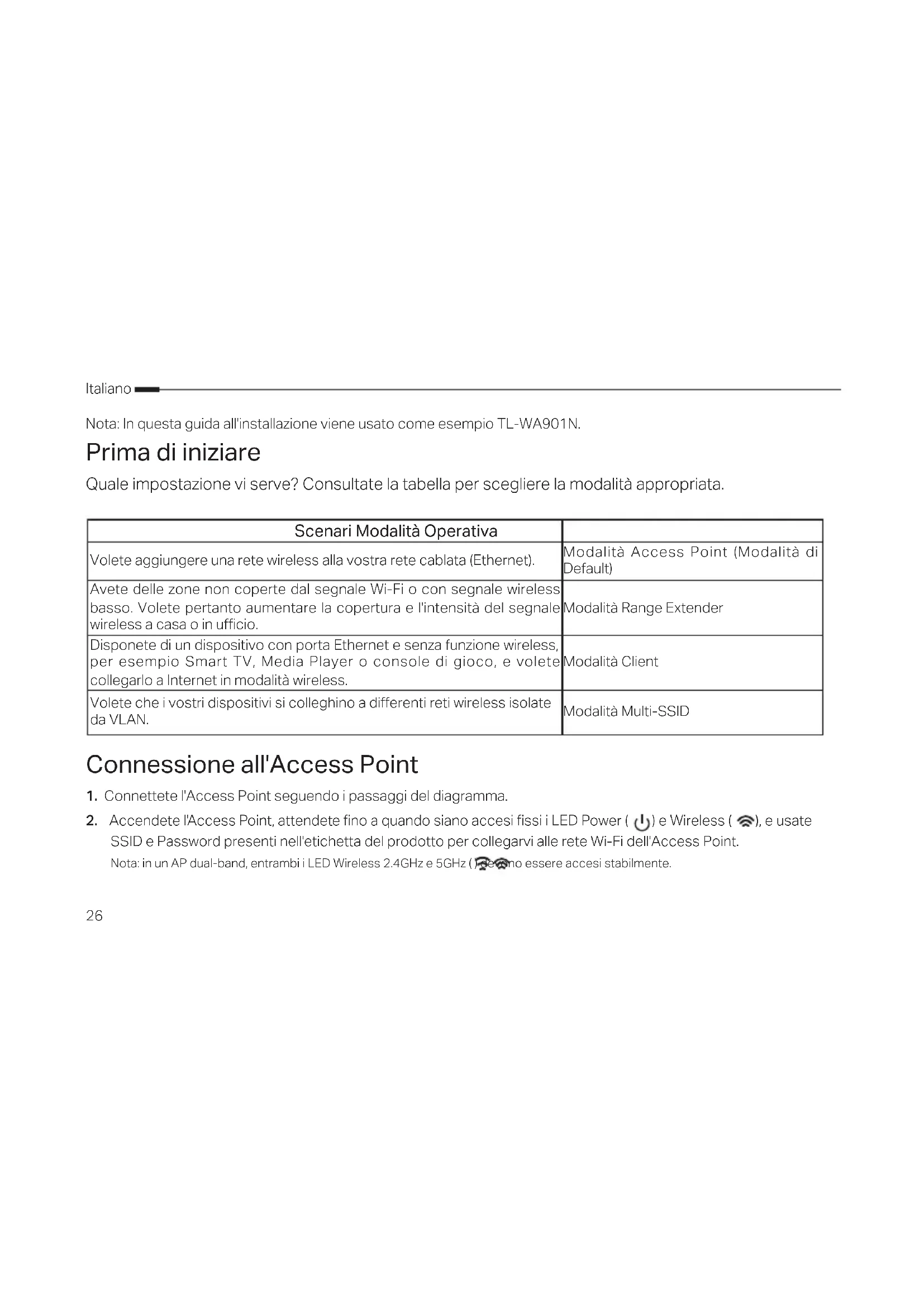 - Déplacer le point d'accès à un autre endroit, à l'écart des appareils Bluetooth et de tout autre appareil électroménager tel que les téléphones sans l, les fours à micro ondes, les baby phones etc. an de minimiser l'inuence des interférences.26 Italiano Nota: In questa guida all'installazione viene usato come esempio TL-WA901N. Prima di iniziare Quale impostazione vi serve? Consultate la tabella per scegliere la modalità appropriata. Scenari Modalità Operativa Volete aggiungere una rete wireless alla vostra rete cablata (Ethernet). Modalità Access Point (Modalità di Default) Avete delle zone non coperte dal segnale Wi-Fi o con segnale wireless basso. Volete pertanto aumentare la copertura e l'intensità del segnale wireless a casa o in ucio. Modalità Range Extender Disponete di un dispositivo con porta Ethernet e senza funzione wireless, per esempio Smart TV, Media Player o console di gioco, e volete collegarlo a Internet in modalità wireless. Modalità Client Volete che i vostri dispositivi si colleghino a dierenti reti wireless isolate da VLAN. Modalità Multi-SSID Connessione all'Access Point