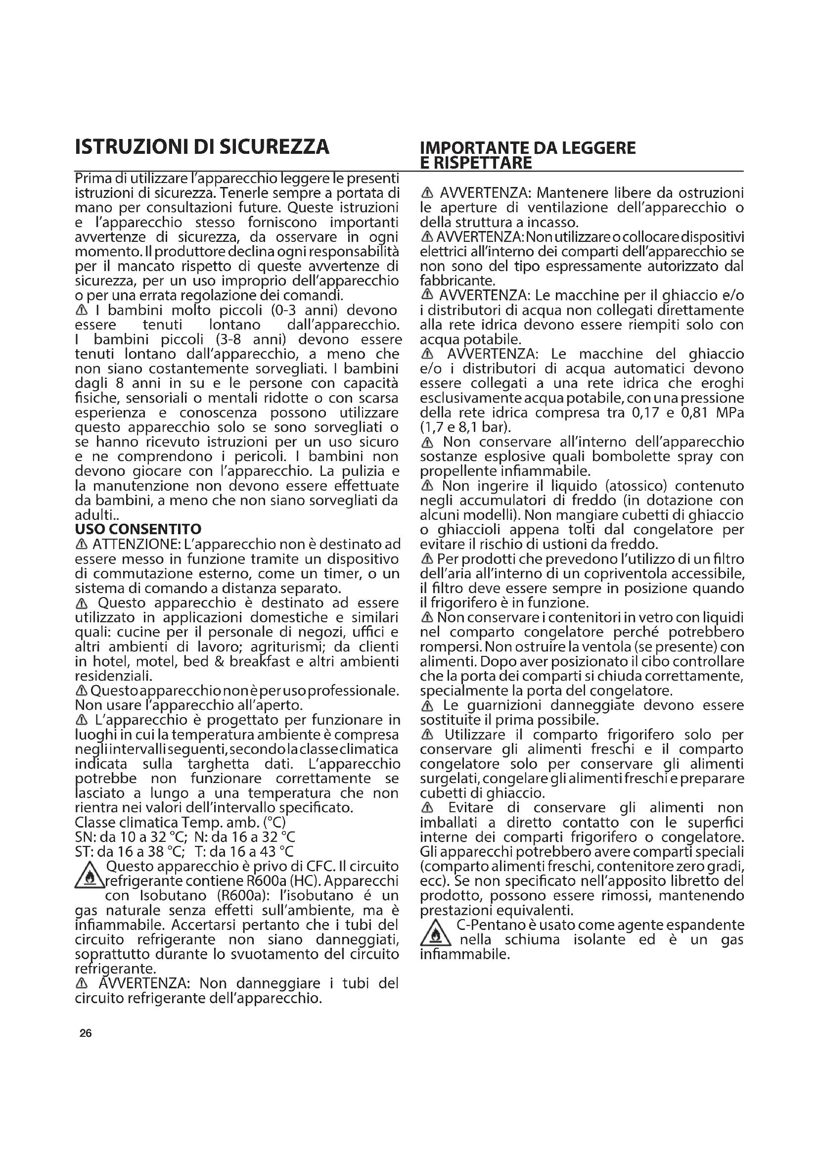 Prima di utilizzare l’apparecchio leggere le presenti istruzioni di sicurezza. Tenerle sempre a portata di mano per consultazioni future. Queste istruzioni e l’apparecchio stesso forniscono importanti avvertenze di sicurezza, da osservare in ogni momento. Il produttore declina ogni responsabilità per il mancato rispetto di queste avvertenze di sicurezza, per un uso improprio dell’apparecchio oper una errata regolazione dei comandi. I bambini molto piccoli (0-3 anni) devono essere tenuti lontano dall’apparecchio. I bambini piccoli (3-8 anni) devono essere tenuti lontano dall’apparecchio, a meno che non siano costantemente sorvegliati. I bambini dagli 8 anni in su e le persone con capacità siche, sensoriali o mentali ridotte o con scarsa esperienza e conoscenza possono utilizzare questo apparecchio solo se sono sorvegliati o se hanno ricevuto istruzioni per un uso sicuro e ne comprendono i pericoli. I bambini non devono giocare con l’apparecchio. La pulizia e la manutenzione non devono essere eettuate da bambini, a meno che non siano sorvegliati da adulti.. USO CONSENTITO ATTENZIONE: L’apparecchio non è destinato ad essere messo in funzione tramite un dispositivo di commutazione esterno, come un timer, o un sistema di comando a distanza separato. Questo apparecchio è destinato ad essere utilizzato in applicazioni domestiche e similari quali: cucine per il personale di negozi, uci e altri ambienti di lavoro; agriturismi; da clienti in hotel, motel, bed & breakfast e altri ambienti residenziali. Questo apparecchio non è per uso professionale. Non usare l’apparecchio all’aperto. L’apparecchio è progettato per funzionare in luoghi in cui la temperatura ambiente è compresa negli intervalli seguenti, secondo la classe climatica indicata sulla targhetta dati. L’apparecchio potrebbe non funzionare correttamente se lasciato a lungo a una temperatura che non rientra nei valori dell’intervallo specicato. Classe climatica Temp. amb. (°C) SN: da 10 a 32 °C; N: da 16 a 32 °C ST: da 16 a 38 °C; T: da 16 a 43 °C Questo apparecchio è privo di CFC. Il circuito refrigerante contiene R600a (HC). Apparecchi con Isobutano (R600a): l’isobutano é un gas naturale senza eetti sull’ambiente, ma è inammabile. Accertarsi pertanto che i tubi del circuito refrigerante non siano danneggiati, soprattutto durante lo svuotamento del circuito refrigerante. AVVERTENZA: Non danneggiare i tubi del circuito refrigerante dell’apparecchio.