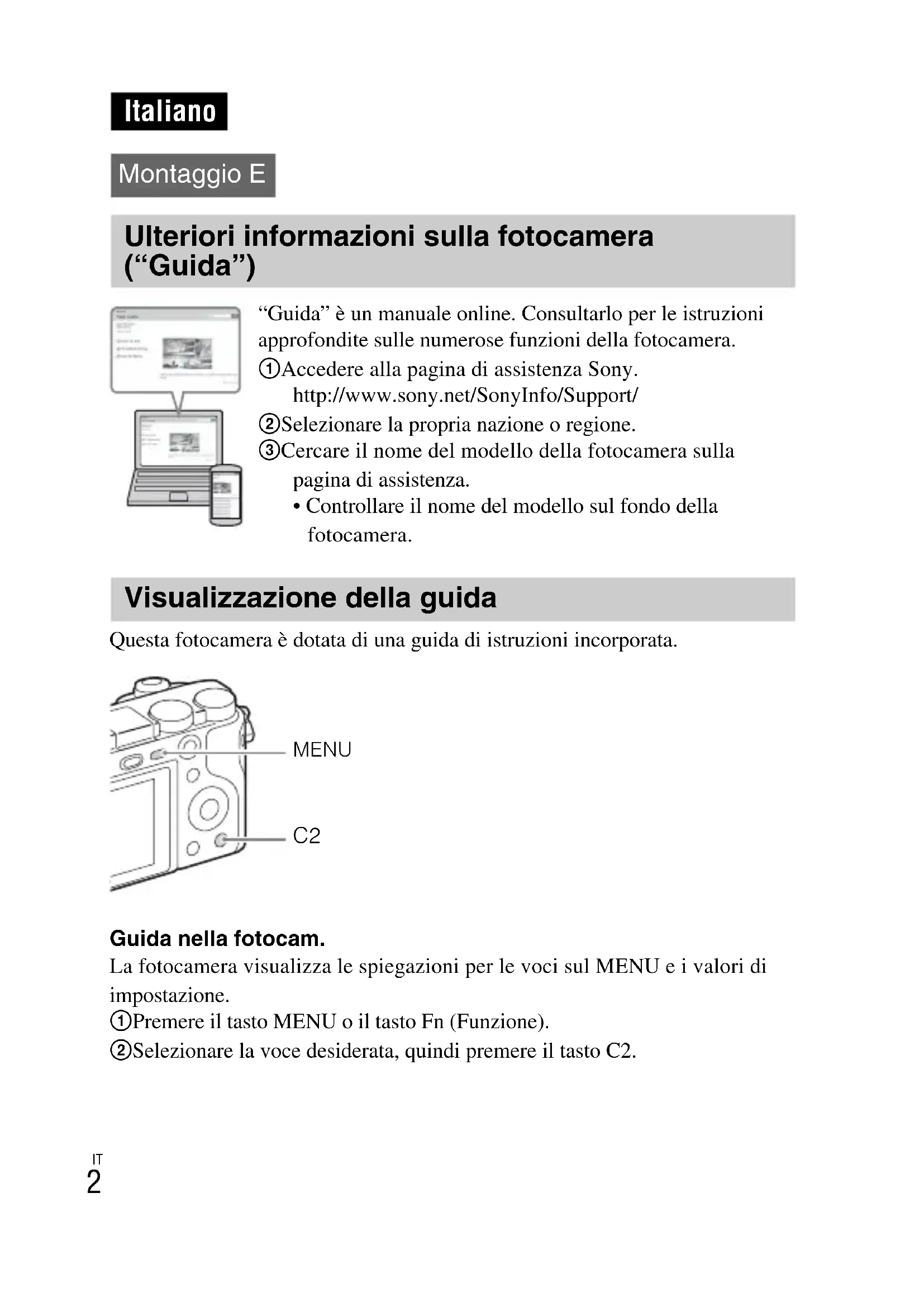 Questa fotocamera è dotata di una guida di istruzioni incorporata. Guida nella fotocam. La fotocamera visualizza le spiegazioni per le voci sul MENU e i valori di impostazione. 1 Premere il tasto MENU o il tasto Fn (Funzione). 2 Selezionare la voce desiderata, quindi premere il tasto C2. Italiano Montaggio E Ulteriori informazioni sulla fotocamera (“Guida”) “Guida” è un manuale online. Consultarlo per le istruzioni approfondite sulle numerose funzioni della fotocamera. 1 Accedere alla pagina di assistenza Sony. http://www.sony.net/SonyInfo/Support/ 2 Selezionare la propria nazione o regione. 3 Cercare il nome del modello della fotocamera sulla pagina di assistenza.