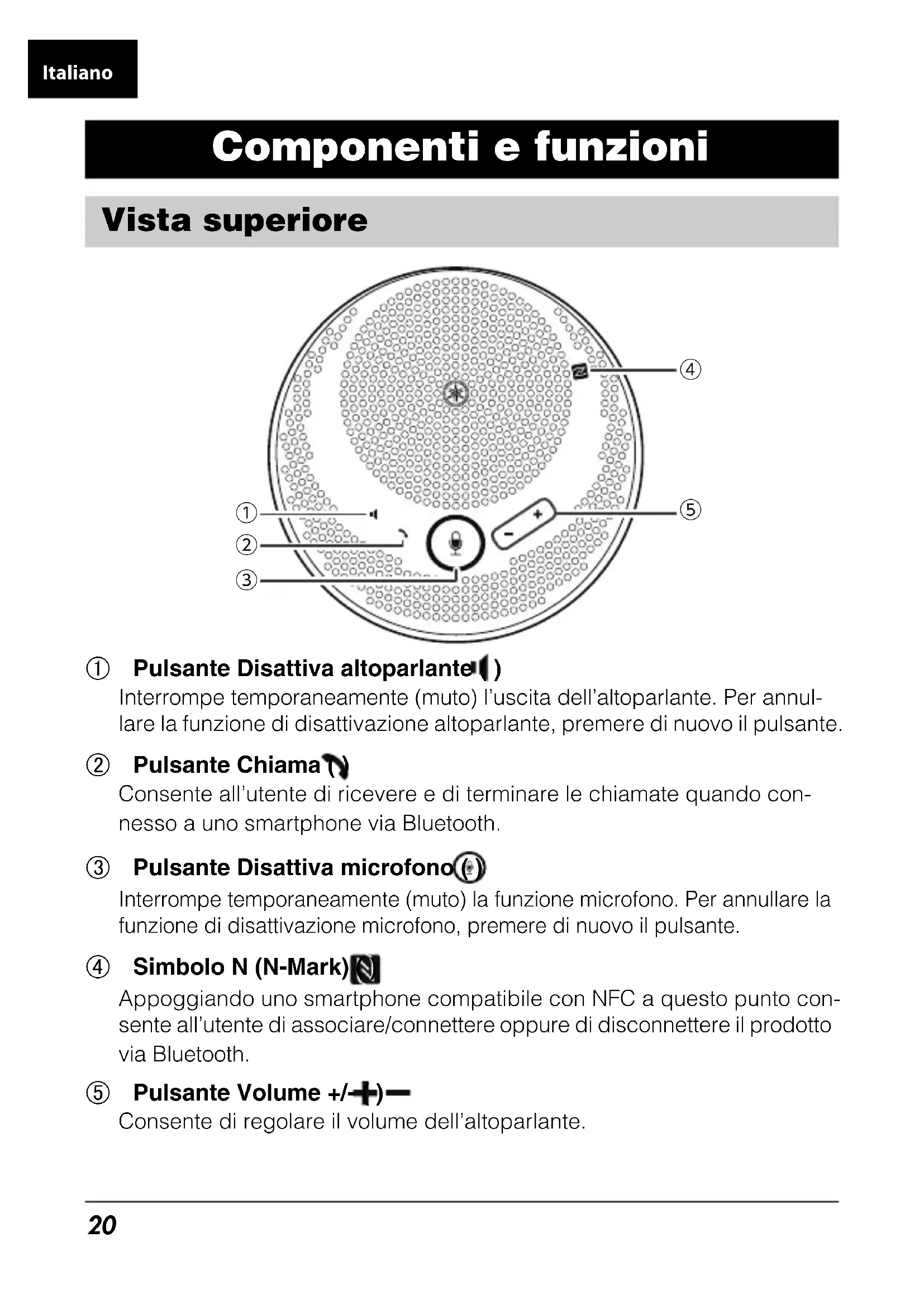 Italiano21 Porta cuffie con microfono ( ) Consente di collegare un set cuffie/microfono al prodotto. Porta USB ( ) Collega un computer o un alimentatore USB commerciale al prodotto uti- lizzando il cavo USB fornito a corredo. Pulsante di accensione/spegnimento ( ) Premuto per più di 2 secondi accende il prodotto. Premuto di nuovo per più di 2 secondi spegne il prodotto. Indicatore della batteria ( ) Lampeggia quando la batteria ricaricabile incorporate si è scaricata. Indica il livello di carica rimanente nella batteria quando viene premuto il pulsante di accensione/spegnimento. Pulsante Bluetooth ( ) Consente all’utente di associare il prodotto, connettere il prodotto o disconnettere il prodotto da uno smartphone via Bluetooth. Indicatore Bluetooth ( ) Indica lo stato di connessione Bluetooth. Per ulteriori dettagli fare riferimento alla Manuale dell’utente sul seguente sito web: https://manual.yamaha.com/uc/yvc-200/ Vista laterale ④⑤①③②⑥22 Utilizzare il cavo USB fornito a corredo per trasferire l’alimentazione e iniziare la ricarica. L’alimentazione può essere trasmessa collegando il prodotto a un computer o un alimentatore USB commerciale. Tenere premuto il pulsante ( ) per più di 2 secondi per accendere il pro- dotto. Caricamento Accensione Alimentatore USB (commerciale) Da collegare a una presa CA Computer Da collegare alla porta USB23 1 Tenere premuto il pulsante Bluetooth ( ) per più di 2 secondi. Il prodotto passa in modalità attesa associazione (pairing) quando l’indica- tore Bluetooth inizia a lampeggiare velocemente. 2 Associare il prodotto con lo smartphone. Accendere il Bluetooth sullo smartphone da connettere e quindi associarlo al dispositivo denominato “YVC-200 Yamaha”. Quando richiesto, immet- tere la passkey “0000”. Connessione a uno smartphone via Bluetooth Associazione Smartphone24 Premendo il pulsante Bluetooth ( ) si connette il prodotto allo smartphone associato/connesso utilizzato più di recente. Appoggiando uno smartphone compatibile con NFC sul simbolo N ( ), l’utente può con un’unica operazione associarlo e connetterlo al prodotto via Bluetooth. Per ulteriori dettagli fare riferimento alla Manuale dell’utente sul seguente sito web: https://manual.yamaha.com/uc/yvc-200/ 1 Collegare il prodotto al computer. Collegare il prodotto al computer tramite il cavo USB fornito a corredo. Il prodotto si alimenterà automaticamente una volta collegato al computer. 2 Configurare le impostazioni audio con il computer. Selezionare “Yamaha YVC-200” nelle impostazioni audio del computer (microfono e altoparlante). Connessione a uno smartphone associato Associazione/connessione via NFC Connessione a un computer via USB