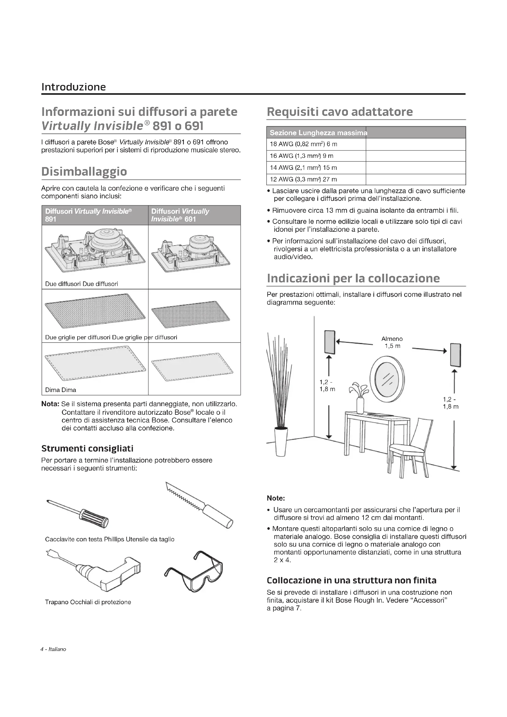 891 o 691 offrono prestazioni superiori per i sistemi di riproduzione musicale stereo. Disimballagio Aprire con cautela la confezione e verificare che i seguenti componenti siano inclusi: Diffusori Virtually Invisible