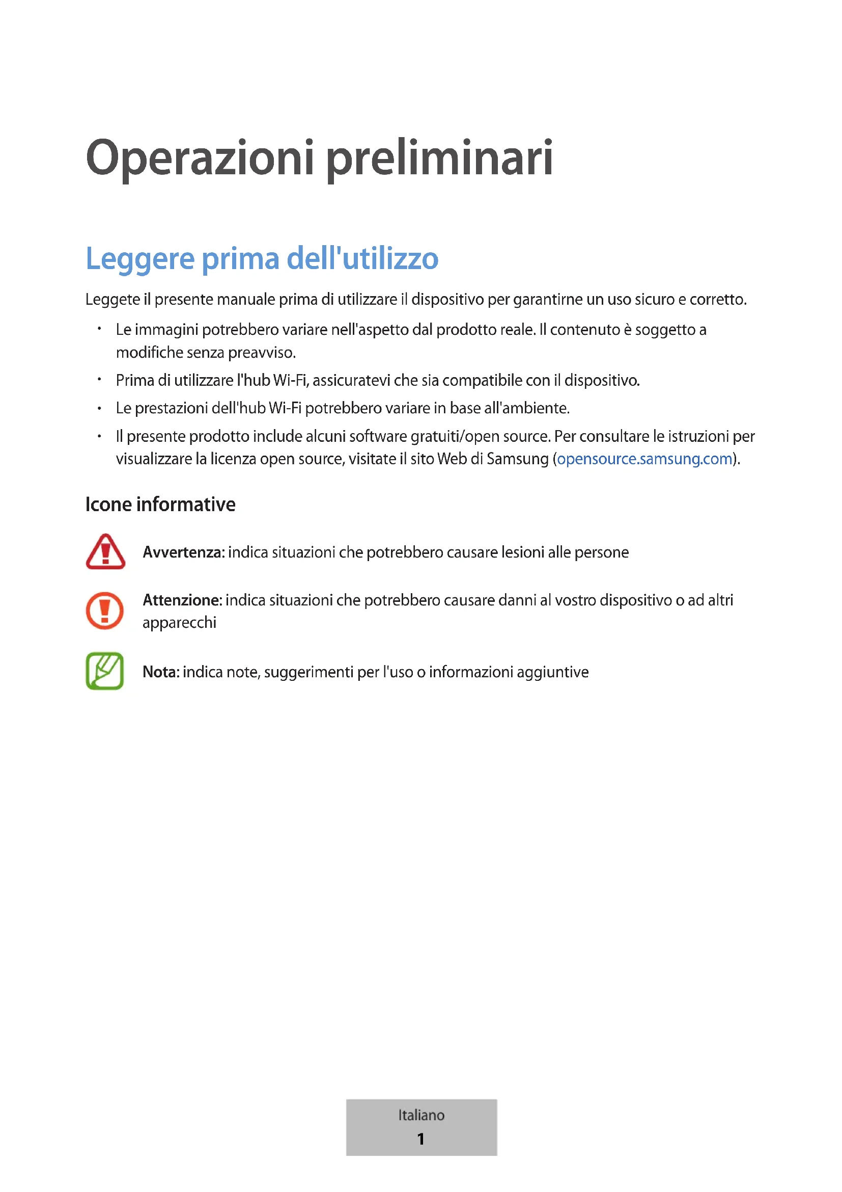 Il presente prodotto include alcuni software gratuiti/open source. Per consultare le istruzioni per visualizzare la licenza open source, visitate il sito Web di Samsung (opensource.samsung.com). Icone informative Avvertenza: indica situazioni che potrebbero causare lesioni alle persone Attenzione: indica situazioni che potrebbero causare danni al vostro dispositivo o ad altri apparecchi Nota: indica note, suggerimenti per l'uso o informazioni aggiuntive Italiano 1Operazioni preliminari