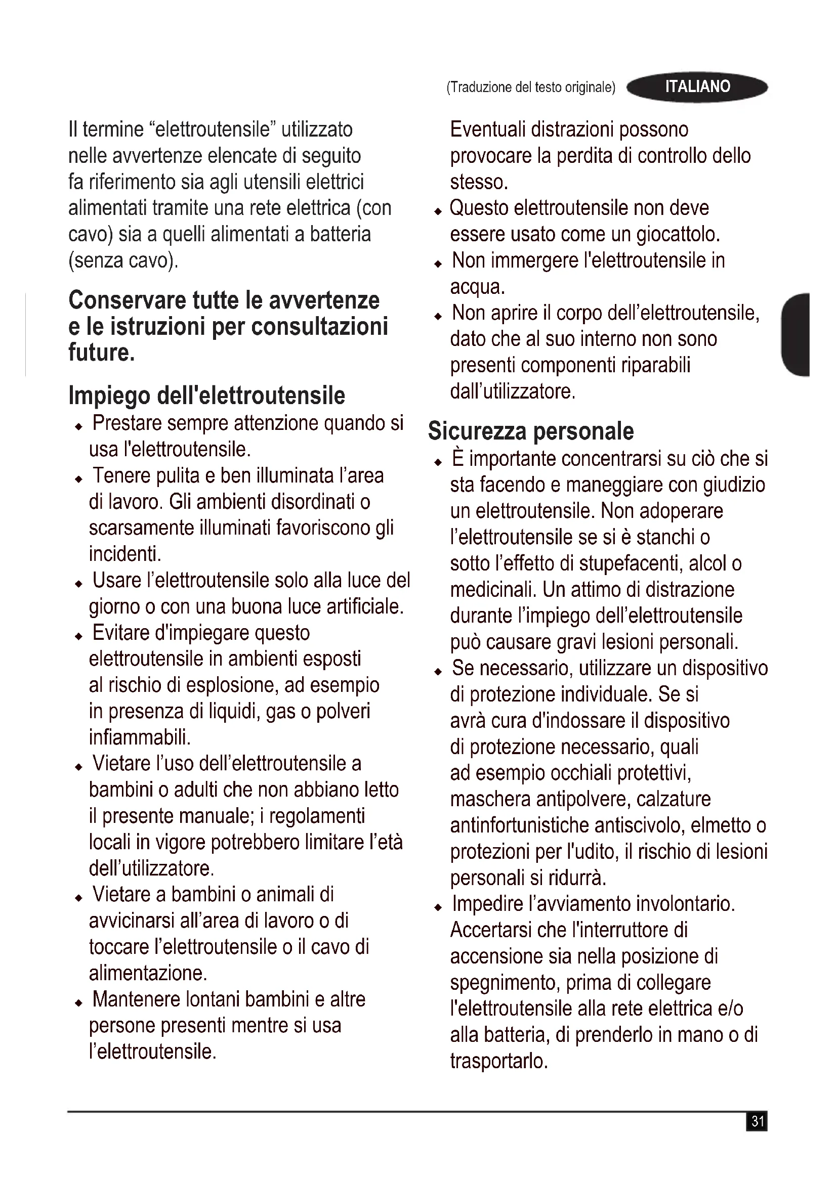 (Traduzione del testo originale) ITALIANO u Non danneggiare/deformare il pacco batteria forandolo o colpendolo, per evitare il rischio di lesioni personali o di incendio. Non caricare le batterie danneggiate. u In condizioni estreme, si potrebbe vericare la perdita di liquido dalle batterie. Se si nota la presenza di liquido sulle batterie, pulirle con attenzione con uno straccio. Evitare il contatto con la pelle. u In caso di contatto con la pelle o gli occhi, seguire le istruzioni riportate di seguito. Avvertenza! Il liquido delle batterie può causare lesioni a persone o danni alle cose. In caso di contatto con la pelle risciacquare immediatamente con acqua. In caso di rossore, dolore o irritazione, rivolgersi immediatamente a un medico. In caso di contatto con gli occhi, risciacquarli immediatamente con acqua pulita e consultare un medico.