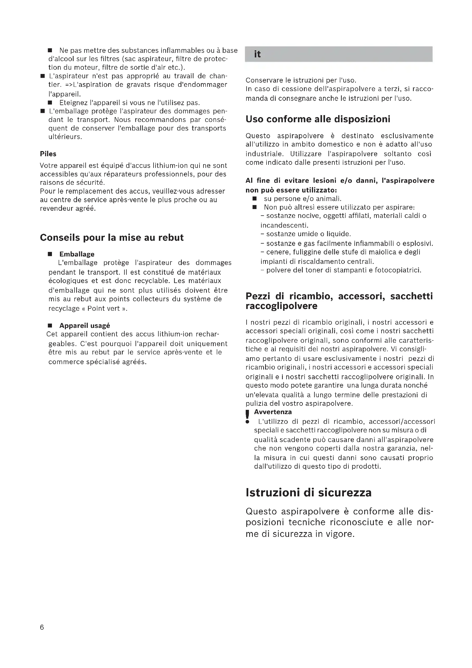 Conservare le istruzioni per l'uso. In caso di cessione dell'aspirapolvere a terzi, si racco- manda di consegnare anche le istruzioni per l'uso. Uso conforme alle disposizioni Questo aspirapolvere è destinato esclusivamente all'utilizzo in ambito domestico e non è adatto all'uso industriale. Utilizzare l'aspirapolvere soltanto così come indicato dalle presenti istruzioni per l'uso. Al fine di evitare lesioni e/o danni, l'aspirapolvere non può essere utilizzato: su persone e/o animali. Non può altresì essere utilizzato per aspirare: − sostanze nocive, oggetti affilati, materiali caldi o incandescenti. − sostanze umide o liquide. − sostanze e gas facilmente infiammabili o esplosivi. − cenere, fuliggine delle stufe di maiolica e degli impianti di riscaldamento centrali. − polvere del toner di stampanti e fotocopiatrici. Pezzi di ricambio, accessori, sacchetti raccoglipolvere I nostri pezzi di ricambio originali, i nostri accessori e accessori speciali originali, così come i nostri sacchetti raccoglipolvere originali, sono conformi alle caratteris- tiche e ai requisiti dei nostri aspirapolvere. Vi consigli- amo pertanto di usare esclusivamente i nostri pezzi di ricambio originali, i nostri accessori e accessori speciali originali e i nostri sacchetti raccoglipolvere originali. In questo modo potete garantire una lunga durata nonché un'elevata qualità a lungo termine delle prestazioni di pulizia del vostro aspirapolvere.