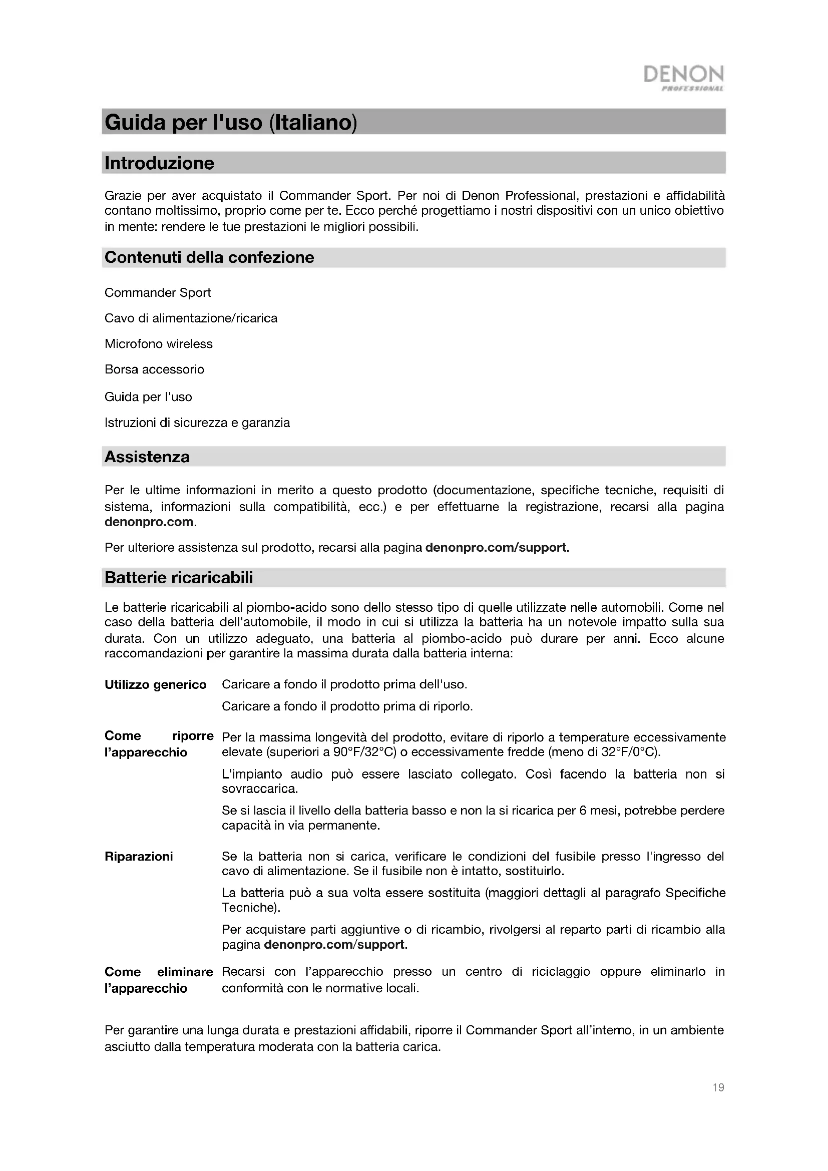 Contenuti della confezione Commander Sport Cavo di alimentazione/ricarica Microfono wireless Borsa accessorio Guida per l'uso Istruzioni di sicurezza e garanzia Assistenza Per le ultime informazioni in merito a questo prodotto (documentazione, specifiche tecniche, requisiti di sistema, informazioni sulla compatibilità, ecc.) e per effettuarne la registrazione, recarsi alla pagina denonpro.com. Per ulteriore assistenza sul prodotto, recarsi alla pagina denonpro.com/support. Batterie ricaricabili Le batterie ricaricabili al piombo-acido sono dello stesso tipo di quelle utilizzate nelle automobili. Come nel caso della batteria dell'automobile, il modo in cui si utilizza la batteria ha un notevole impatto sulla sua durata. Con un utilizzo adeguato, una batteria al piombo-acido può durare per anni. Ecco alcune raccomandazioni per garantire la massima durata dalla batteria interna: Utilizzo generico Caricare a fondo il prodotto prima dell'uso. Caricare a fondo il prodotto prima di riporlo. Come riporre l’apparecchio Per la massima longevità del prodotto, evitare di riporlo a temperature eccessivamente elevate (superiori a 90°F/32°C) o eccessivamente fredde (meno di 32°F/0°C). L'impianto audio può essere lasciato collegato. Così facendo la batteria non si sovraccarica. Se si lascia il livello della batteria basso e non la si ricarica per 6 mesi, potrebbe perdere capacità in via permanente. Riparazioni Se la batteria non si carica, verificare le condizioni del fusibile presso l'ingresso del cavo di alimentazione. Se il fusibile non è intatto, sostituirlo. La batteria può a sua volta essere sostituita (maggiori dettagli al paragrafo Specifiche Tecniche). Per acquistare parti aggiuntive o di ricambio, rivolgersi al reparto parti di ricambio alla pagina denonpro.com/support. Come eliminare l’apparecchio Recarsi con l’apparecchio presso un centro di riciclaggio oppure eliminarlo in conformità con le normative locali. Per garantire una lunga durata e prestazioni affidabili, riporre il Commander Sport all’interno, in un ambiente asciutto dalla temperatura moderata con la batteria carica.20