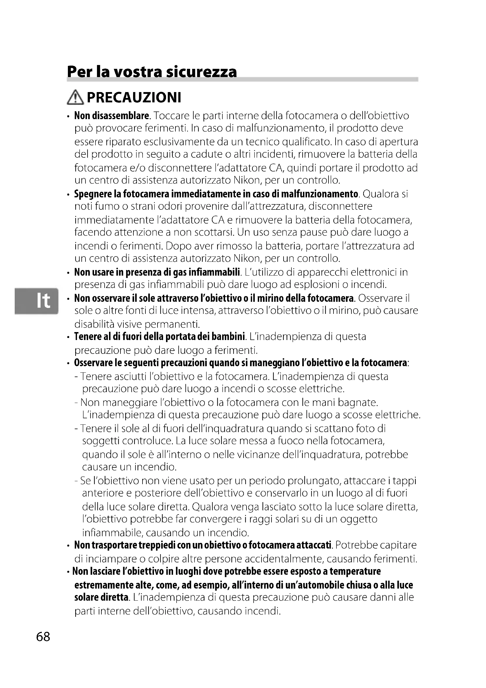 - Non disassemblare. Toccare le parti interne della fotocamera o dell’obiettivo può provocare ferimenti. In caso di malfunzionamento, il prodotto deve essere riparato esclusivamente da un tecnico qualificato. In caso di apertura del prodotto in seguito a cadute o altri incidenti, rimuovere la batteria della fotocamera e/o disconnettere l’adattatore CA, quindi portare il prodotto ad un centro di assistenza autorizzato Nikon, per un controllo.