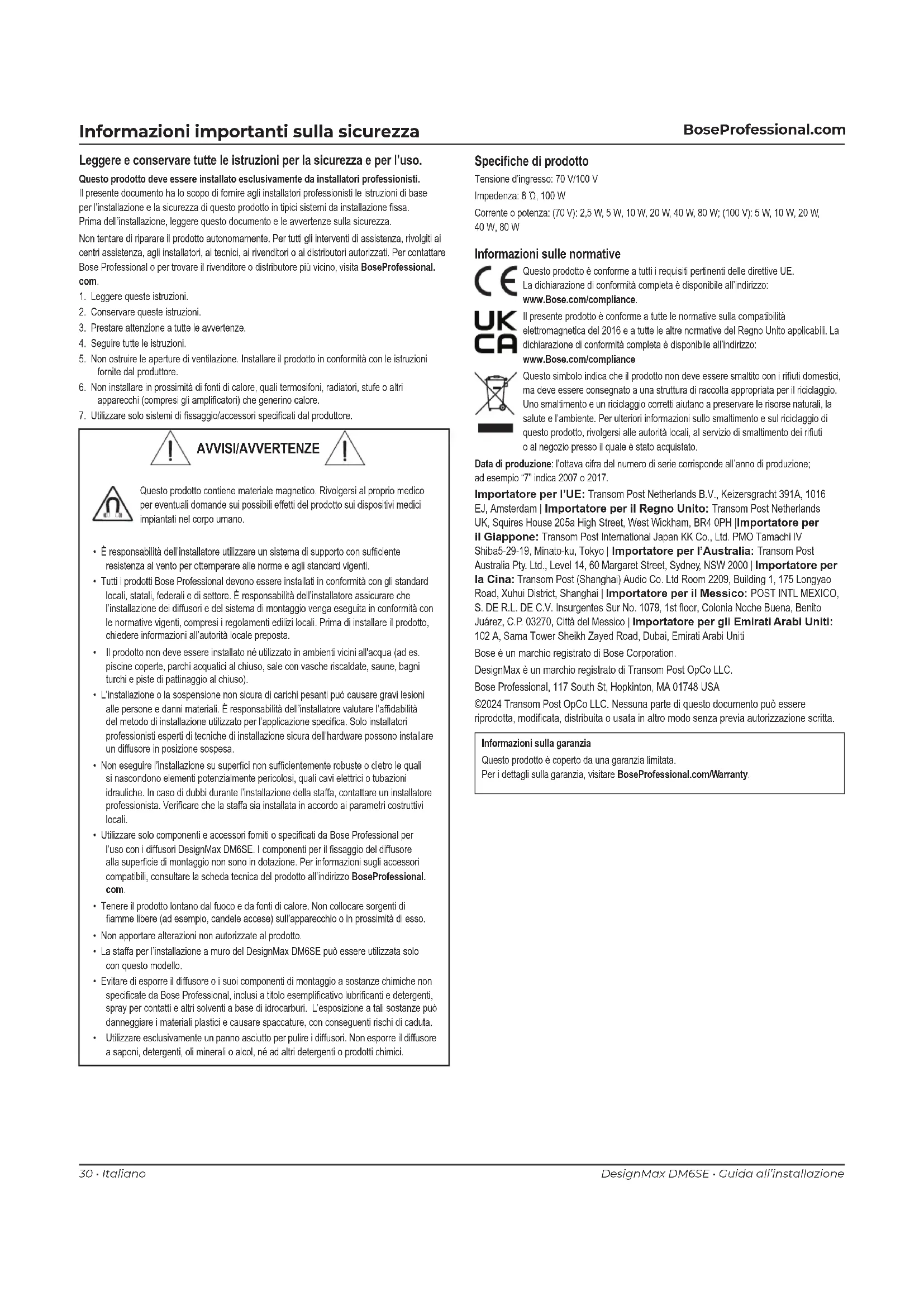 - Utilizzare esclusivamente un panno asciutto per pulire i diffusori. Non esporre il diffusore a saponi, detergenti, oli minerali o alcol, né ad altri detergenti o prodotti chimici. Speciche di prodotto Tensione d’ingresso: 70 V/100 VImpedenza: 8 Ώ, 100 W Corrente o potenza: (70 V): 2,5 W, 5 W, 10 W, 20 W, 40 W, 80 W; (100 V): 5 W, 10 W, 20 W, 40 W, 80 W Informazioni sulle normative Questo prodotto è conforme a tutti i requisiti pertinenti delle direttive UE. La dichiarazione di conformità completa è disponibile all’indirizzo: www.Bose.com/compliance.Il presente prodotto è conforme a tutte le normative sulla compatibilità elettromagnetica del 2016 e a tutte le altre normative del Regno Unito applicabili. La dichiarazione di conformità completa è disponibile all’indirizzo: www.Bose.com/compliance Questo simbolo indica che il prodotto non deve essere smaltito con i riuti domestici, ma deve essere consegnato a una struttura di raccolta appropriata per il riciclaggio. Uno smaltimento e un riciclaggio corretti aiutano a preservare le risorse naturali, la salute e l’ambiente. Per ulteriori informazioni sullo smaltimento e sul riciclaggio di questo prodotto, rivolgersi alle autorità locali, al servizio di smaltimento dei riuti o al negozio presso il quale è stato acquistato.Data di produzione: l’ottava cifra del numero di serie corrisponde all’anno di produzione; ad esempio “7” indica 2007 o 2017. Importatore per l’UE: Transom Post Netherlands B.V., Keizersgracht 391A, 1016 EJ, Amsterdam | Importatore per il Regno Unito: Transom Post Netherlands UK, Squires House 205a High Street, West Wickham, BR4 0PH |Importatore per il Giappone: Transom Post International Japan KK Co., Ltd. PMO Tamachi IV Shiba5-29-19, Minato-ku, Tokyo | Importatore per l’Australia: Transom Post Australia Pty. Ltd., Level 14, 60 Margaret Street, Sydney, NSW 2000 | Importatore per la Cina: Transom Post (Shanghai) Audio Co. Ltd Room 2209, Building 1, 175 Longyao Road, Xuhui District, Shanghai | Importatore per il Messico: POST INTL MEXICO, S. DE R.L. DE C.V. Insurgentes Sur No. 1079, 1st oor, Colonia Noche Buena, Benito Juárez, C.P. 03270, Città del Messico | Importatore per gli Emirati Arabi Uniti: 102 A, Sama Tower Sheikh Zayed Road, Dubai, Emirati Arabi Uniti Bose è un marchio registrato di Bose Corporation. DesignMax è un marchio registrato di Transom Post OpCo LLC. Bose Professional, 117 South St, Hopkinton, MA 01748 USA ©2024 Transom Post OpCo LLC. Nessuna parte di questo documento può essere riprodotta, modicata, distribuita o usata in altro modo senza previa autorizzazione scritta. Informazioni sulla garanziaQuesto prodotto è coperto da una garanzia limitata. Per i dettagli sulla garanzia, visitare BoseProfessional.com/Warranty.Italiano • 31Guida all’installazione • DesignMax DM6SE BoseProfessional.com Panoramica Contenuto della confezione Dimensioni del prodotto 2 pz. 2 pz. 2 pz. 2 pz. 267 mm 210 mm 222 mm 223 mm 229 mm 245 mm 340 mm Specifiche tecniche Per ulteriori specifiche, consultare la scheda tecnica del diffusore DesignMax DM6SE all’indirizzo BoseProfessional.com. Caratteristiche fisiche Dimensioni del prodotto Altezza: 340 mm Larghezza: 222 mm Profondità: 229 mm Peso netto del diffusore con griglia e staffa (singolo) 6,40 kg (14,1 lb) Peso di spedizione (coppia) 14,74 kg (32,5 lb) Informazioni importanti sull’installazione Prima di installare il diffusore, consultare la sezione Informazioni importanti sulla sicurezza a pagina 30. Ø 5,5 mm32 • Italiano DesignMax DM6SE • Guida all’installazione BoseProfessional.com Configurazione Opzioni di installazione Opzioni ed accessori di installazione q Staffa di fissaggio (in dotazione) w Surface-Mount Pan and Tilt Bracket (opzionale) Staffa per fissaggio a soffitto CMBS2 (opzionale, solo per interni) Pole Mount Bracket (opzionale)