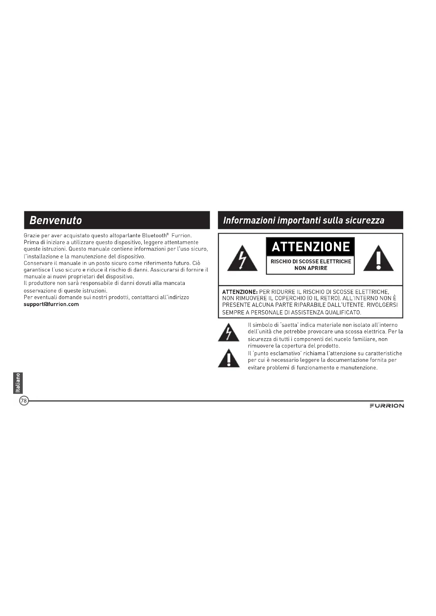 Furrion. Prima di iniziare a utilizzare questo dispositivo, leggere attentamente queste istruzioni. Questo manuale contiene informazioni per l’uso sicuro, l’installazione e la manutenzione del dispositivo. Conservare il manuale in un posto sicuro come riferimento futuro. Ciò garantisce l’uso sicuro e riduce il rischio di danni. Assicurarsi di fornire il manuale ai nuovi proprietari del dispositivo. Il produttore non sarà responsabile di danni dovuti alla mancata osservazione di queste istruzioni. Per eventuali domande sui nostri prodotti, contattarci all’indirizzo support@furrion.com Benvenuto Informazioni importanti sulla sicurezza79 Italiano