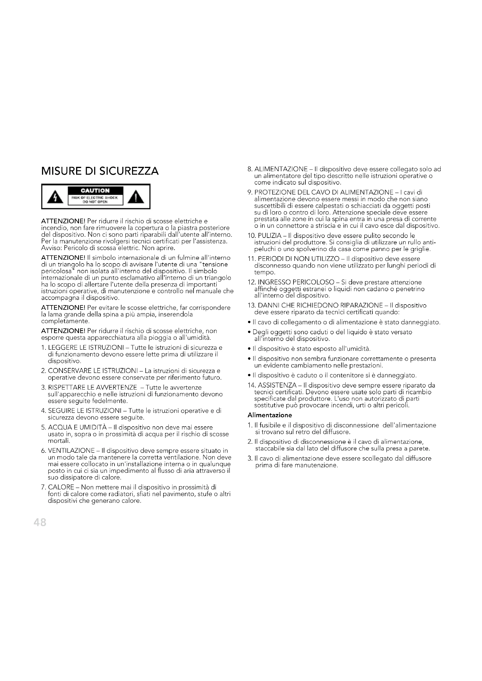 ATTENZIONE! Per ridurre il rischio di scosse elettriche e incendio, non fare rimuovere la copertura o la piastra posteriore del dispositivo. Non ci sono parti riparabili dall’utente all’interno. Per la manutenzione rivolgersi tecnici certificati per l’assistenza. Avviso: Pericolo di scossa elettric. Non aprire. ATTENZIONE! Il simbolo internazionale di un fulmine all'interno di un triangolo ha lo scopo di avvisare l'utente di una "tensione pericolosa" non isolata all'interno del dispositivo. Il simbolo internazionale di un punto esclamativo all'interno di un triangolo ha lo scopo di allertare l'utente della presenza di importanti istruzioni operative, di manutenzione e controllo nel manuale che accompagna il dispositivo. ATTENZIONE! Per evitare le scosse elettriche, far corrispondere la lama grande della spina a più ampia, inserendola completamente. ATTENZIONE! Per ridurre il rischio di scosse elettriche, non esporre questa apparecchiatura alla pioggia o all'umidità.