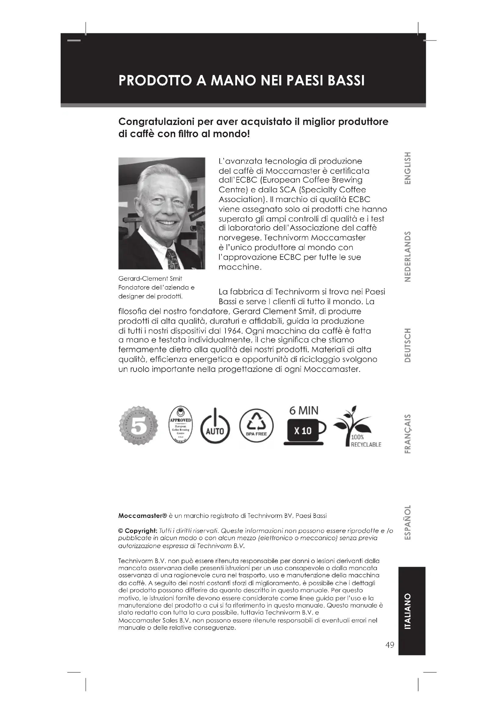 Moccamaster® è un marchio registrato di Technivorm BV, Paesi Bassi © Copyright: Tutti i diritti riservati. Queste informazioni non possono essere riprodotte e /o pubblicate in alcun modo o con alcun mezzo (elettronico o meccanico) senza previa autorizzazione espressa di Technivorm B.V. Technivorm B.V. non può essere ritenuta responsabile per danni o lesioni derivanti dalla mancata osservanza delle presenti istruzioni per un uso consapevole o dalla mancata osservanza di una ragionevole cura nel trasporto, uso e manutenzione della macchina da caffè. A seguito dei nostri costanti sforzi di miglioramento, è possibile che i dettagli del prodotto possano differire da quanto descritto in questo manuale. Per questo motivo, le istruzioni fornite devono essere considerate come linee guida per l’uso e la manutenzione del prodotto a cui si fa riferimento in questo manuale. Questo manuale è stato redatto con tutta la cura possibile, tuttavia Technivorm B.V. e Moccamaster Sales B.V. non possono essere ritenute responsabili di eventuali errori nel manuale o delle relative conseguenze. L’avanzata tecnologia di produzione del caffè di Moccamaster è certicata dall’ECBC (European Coffee Brewing Centre) e dalla SCA (Specialty Coffee Association). Il marchio di qualità ECBC viene assegnato solo ai prodotti che hanno superato gli ampi controlli di qualità e i test di laboratorio dell’Associazione del caffè norvegese. Technivorm Moccamaster è l’unico produttore al mondo con l’approvazione ECBC per tutte le sue macchine. La fabbrica di Technivorm si trova nei Paesi Bassi e serve I clienti di tutto il mondo. La losoa del nostro fondatore, Gerard Clement Smit, di produrre prodotti di alta qualità, duraturi e afdabili, guida la produzione di tutti i nostri dispositivi dal 1964. Ogni macchina da caffè è fatta a mano e testata individualmente, il che signica che stiamo fermamente dietro alla qualità dei nostri prodotti. Materiali di alta qualità, efcienza energetica e opportunità di riciclaggio svolgono un ruolo importante nella progettazione di ogni Moccamaster. Gerard-Clement Smit Fondatore dell’azienda e designer dei prodotti. Congratulazioni per aver acquistato il miglior produttore di caffè con ltro al mondo!
