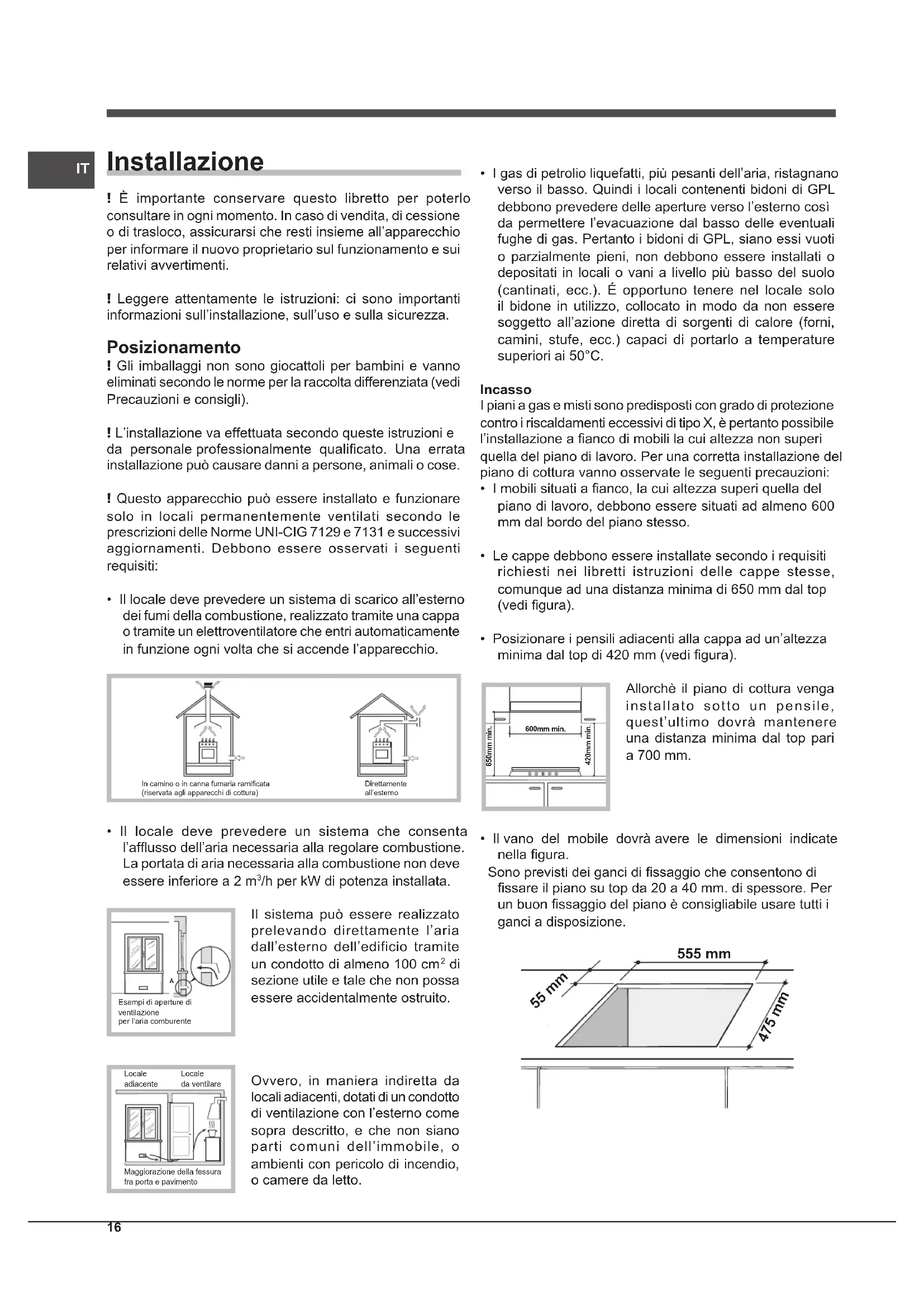 Installazione ! È importante conservare questo libretto per poterlo consultare in ogni momento. In caso di vendita, di cessione o di trasloco, assicurarsi che resti insieme all’apparecchio per informare il nuovo proprietario sul funzionamento e sui relativi avvertimenti. ! Leggere attentamente le istruzioni: ci sono importanti informazioni sull’installazione, sull’uso e sulla sicurezza. Posizionamento ! Gli imballaggi non sono giocattoli per bambini e vanno eliminati secondo le norme per la raccolta differenziata (vedi Precauzioni e consigli). ! L’installazione va effettuata secondo queste istruzioni e da personale professionalmente qualicato. Una errata installazione può causare danni a persone, animali o cose. ! Questo apparecchio può essere installato e funzionare solo in locali permanentemente ventilati secondo le prescrizioni delle Norme UNI-CIG 7129 e 7131 e successivi aggiornamenti. Debbono essere osservati i seguenti requisiti: