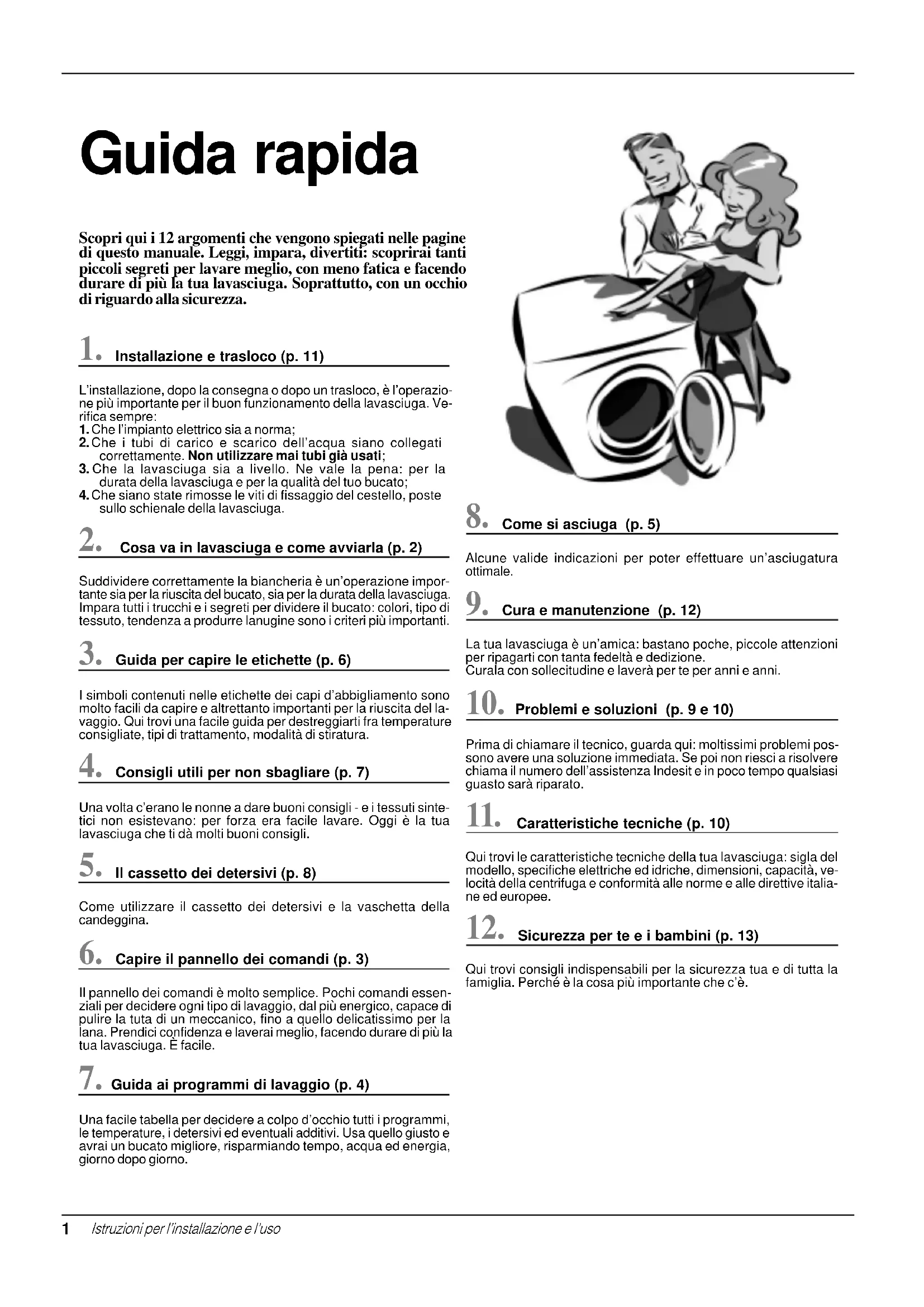 FIstruzioni per linstallazione e luso Scopri qui i 12 argomenti che vengono spiegati nelle pagine di questo manuale. Leggi, impara, divertiti: scoprirai tanti piccoli segreti per lavare meglio, con meno fatica e facendo durare di più la tua lavasciuga. Soprattutto, con un occhio di riguardo alla sicurezza. Guida rapida