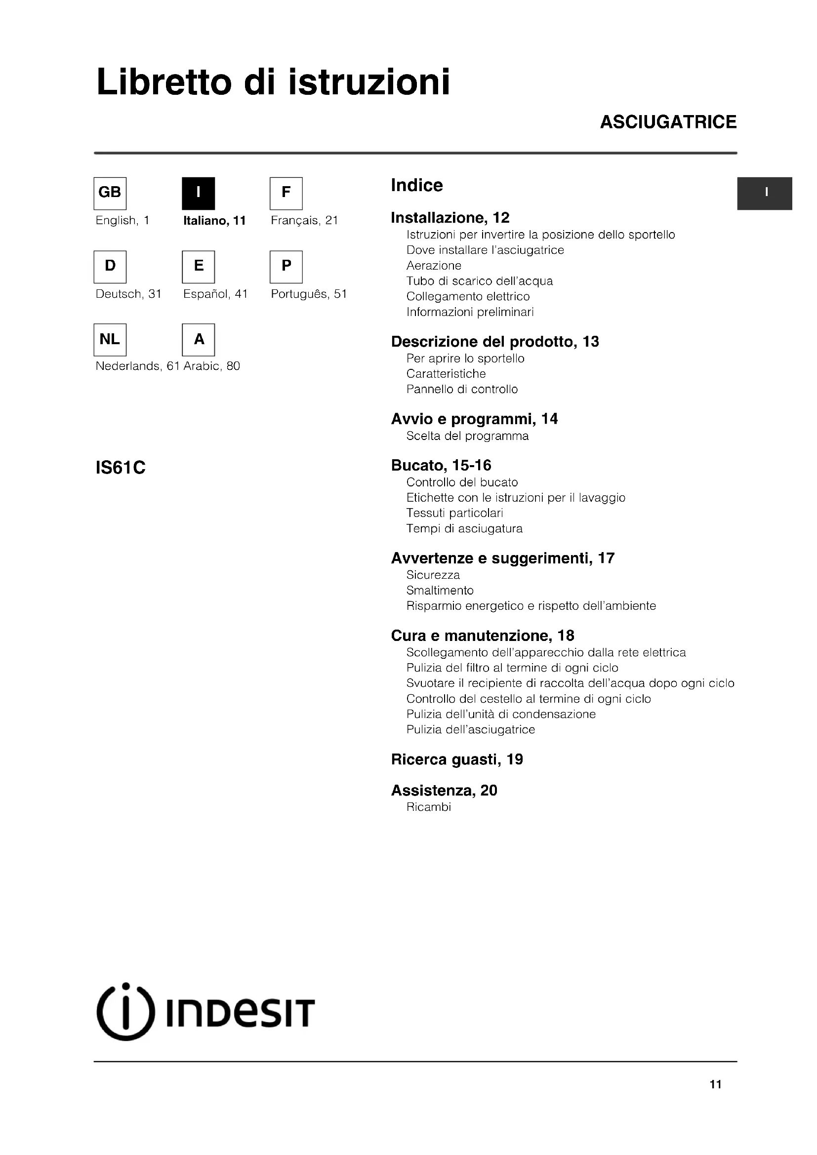 the serial number (S/N). This information can be found on the data label inside the door of the machine. 10Indice ASCIUGATRICE IS61C Libretto di istruzioni Installazione, 12 Istruzioni per invertire la posizione dello sportello Dove installare l’asciugatrice Aerazione Tubo di scarico dell’acqua Collegamento elettrico Informazioni preliminari Descrizione del prodotto, 13 Per aprire lo sportello Caratteristiche Pannello di controllo Avvio e programmi, 14 Scelta del programma Bucato, 15-16 Controllo del bucato Etichette con le istruzioni per il lavaggio Tessuti particolari Tempi di asciugatura Avvertenze e suggerimenti, 17 Sicurezza Smaltimento Risparmio energetico e rispetto dell’ambiente Cura e manutenzione, 18 Scollegamento dell’apparecchio dalla rete elettrica Pulizia del filtro al termine di ogni ciclo Svuotare il recipiente di raccolta dell’acqua dopo ogni ciclo Controllo del cestello al termine di ogni ciclo Pulizia dell’unità di condensazione Pulizia dell’asciugatrice Ricerca guasti, 19 Assistenza, 20 Ricambi