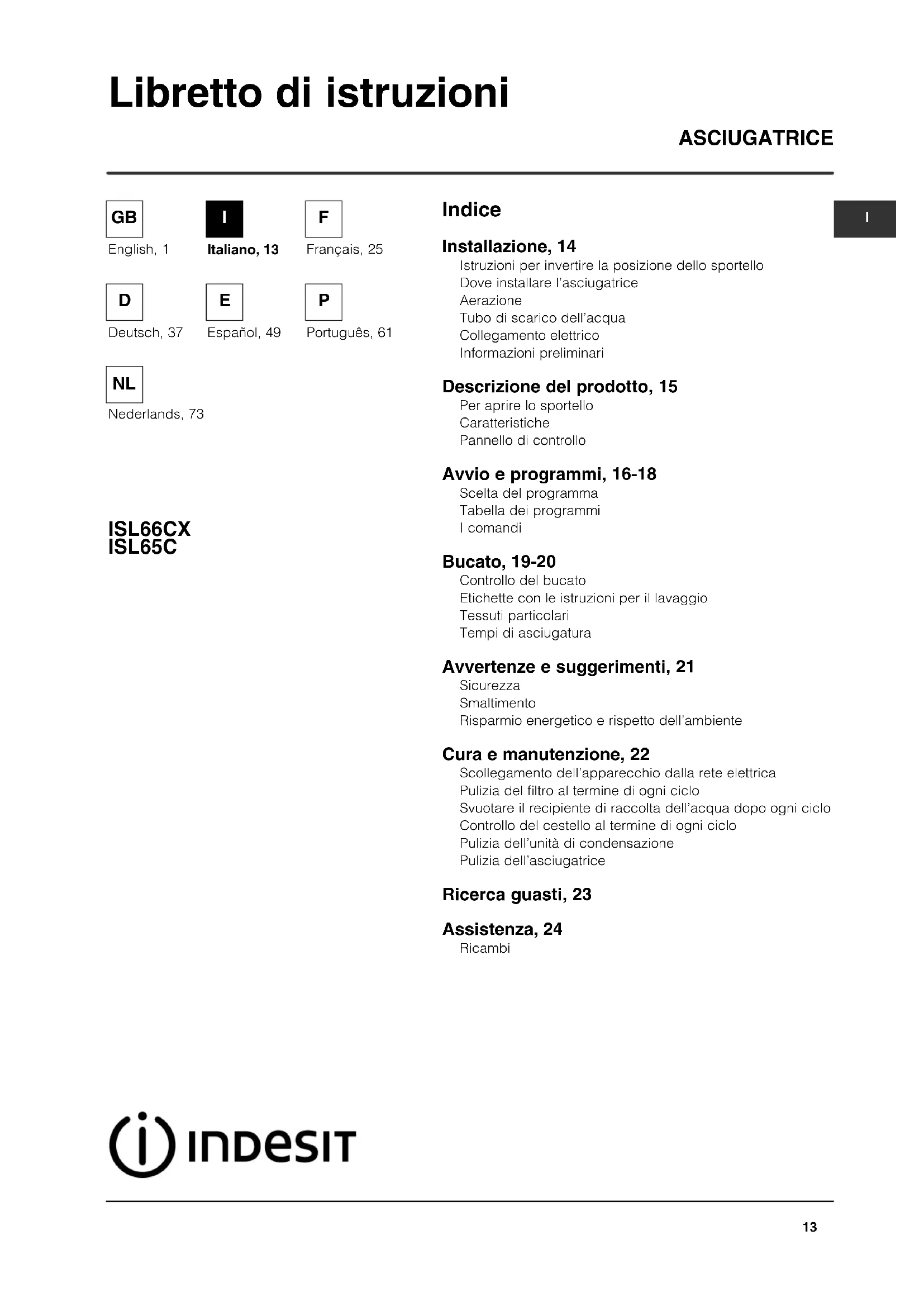 Programmes recommended for comparative test to EN61121 ! Note: This is not a full list of programme options (see Start and Programmes). Programme Programme to select Load size (EN61121) Dry Cotton 2 Cottons - Hanger Dry 6 kg Iron Dry Cotton 3 Cottons - Ready to Iron 6 kg Easy-care textile 4 Synthetics - Cupboard Dry 3 kgIndice ASCIUGATRICE ISL66CX ISL65C Libretto di istruzioni Installazione, 14 Istruzioni per invertire la posizione dello sportello Dove installare l’asciugatrice Aerazione Tubo di scarico dell’acqua Collegamento elettrico Informazioni preliminari Descrizione del prodotto, 15 Per aprire lo sportello Caratteristiche Pannello di controllo Avvio e programmi, 16-18 Scelta del programma Tabella dei programmi I comandi Bucato, 19-20 Controllo del bucato Etichette con le istruzioni per il lavaggio Tessuti particolari Tempi di asciugatura Avvertenze e suggerimenti, 21 Sicurezza Smaltimento Risparmio energetico e rispetto dell’ambiente Cura e manutenzione, 22 Scollegamento dell’apparecchio dalla rete elettrica Pulizia del filtro al termine di ogni ciclo Svuotare il recipiente di raccolta dell’acqua dopo ogni ciclo Controllo del cestello al termine di ogni ciclo Pulizia dell’unità di condensazione Pulizia dell’asciugatrice Ricerca guasti, 23 Assistenza, 24 Ricambi
