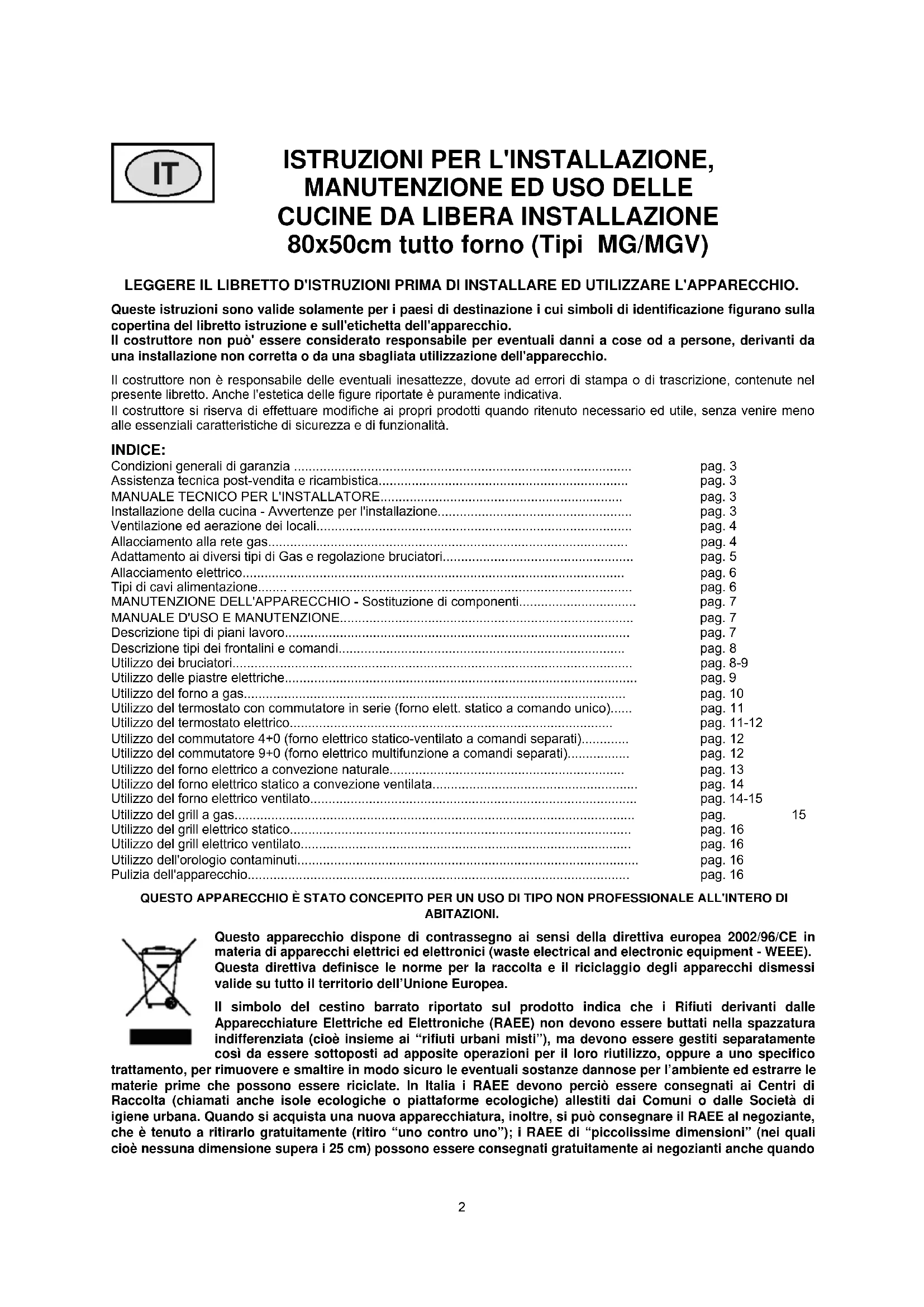 Utilizzo del grill elettrico ventilato.......................................................................................... pag. 16 Utilizzo dell'orologio contaminuti............................................................................................. pag. 16 Pulizia dell'apparecchio........................................................................................................ pag. 16 QUESTO APPARECCHIO È STATO CONCEPITO PER UN USO DI TIPO NON PROFESSIONALE ALL'INTERO DI ABITAZIONI. Questo apparecchio dispone di contrassegno ai sensi della direttiva europea 2002/96/CE in materia di apparecchi elettrici ed elettronici (waste electrical and electronic equipment - WEEE). Questa direttiva definisce le norme per la raccolta e il riciclaggio degli apparecchi dismessi valide su tutto il territorio dell’Unione Europea. Il simbolo del cestino barrato riportato sul prodotto indica che i Rifiuti derivanti dalle Apparecchiature Elettriche ed Elettroniche (RAEE) non devono essere buttati nella spazzatura indifferenziata (cioè insieme ai “rifiuti urbani misti”), ma devono essere gestiti separatamente così da essere sottoposti ad apposite operazioni per il loro riutilizzo, oppure a uno specifico trattamento, per rimuovere e smaltire in modo sicuro le eventuali sostanze dannose per l’ambiente ed estrarre le materie prime che possono essere riciclate. In Italia i RAEE devono perciò essere consegnati ai Centri di Raccolta (chiamati anche isole ecologiche o piattaforme ecologiche) allestiti dai Comuni o dalle Società di igiene urbana. Quando si acquista una nuova apparecchiatura, inoltre, si può consegnare il RAEE al negoziante, che è tenuto a ritirarlo gratuitamente (ritiro “uno contro uno”); i RAEE di “piccolissime dimensioni” (nei quali cioè nessuna dimensione supera i 25 cm) possono essere consegnati gratuitamente ai negozianti anche quando ISTRUZIONI PER L'INSTALLAZIONE,