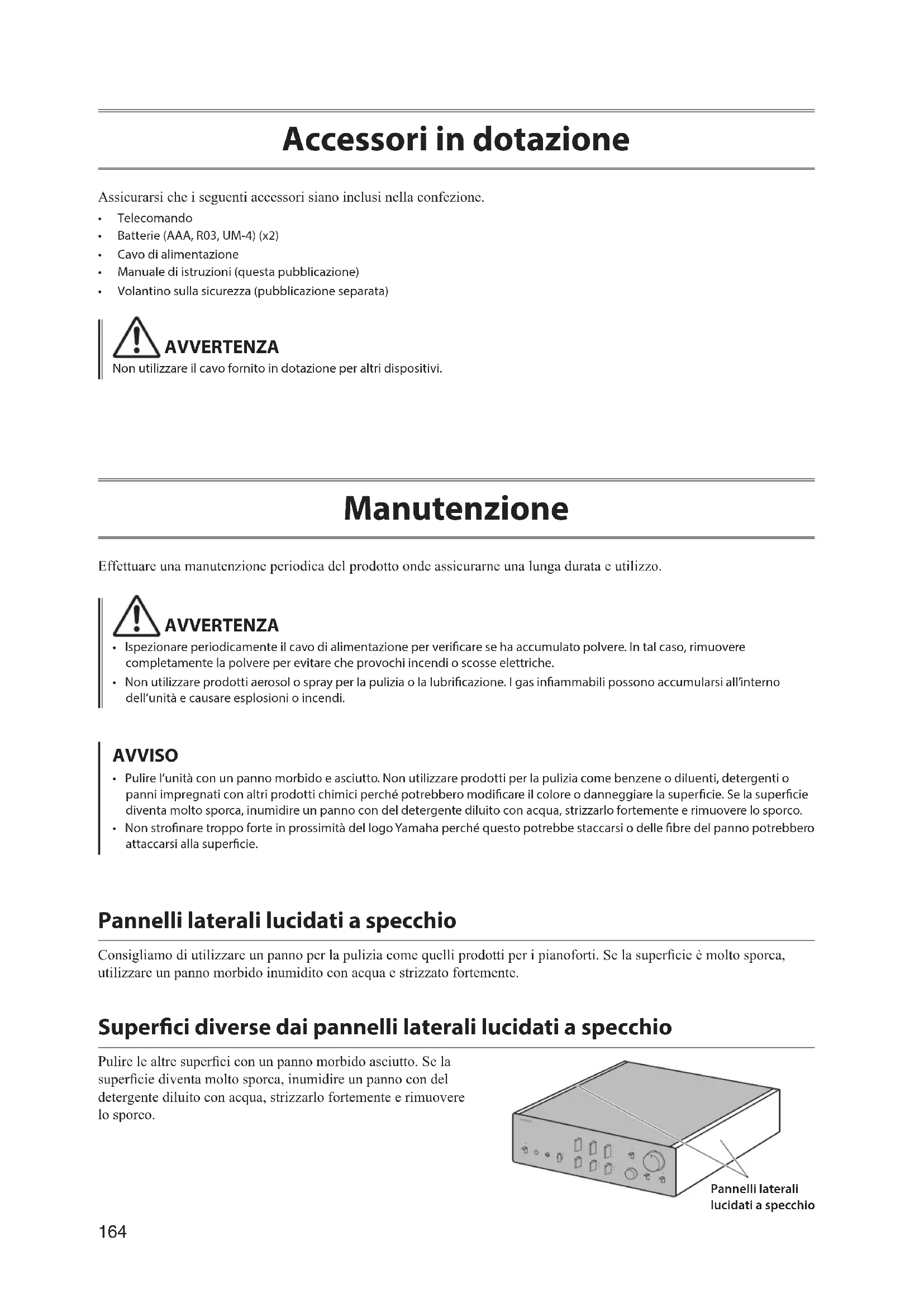 - Telecomando• Batterie (AAA, R03, UM-4) (x2)• Cavo di alimentazione• Manuale di istruzioni (questa pubblicazione)• Volantino sulla sicurezza (pubblicazione separata) AVVERTENZA Non utilizzare il cavo fornito in dotazione per altri dispositivi. Manutenzione Effettuare una manutenzione periodica del prodotto onde assicurarne una lunga durata e utilizzo. AVVERTENZA