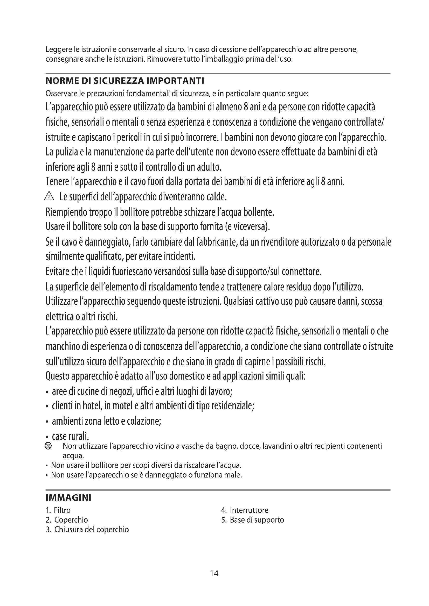 Osservare le precauzioni fondamentali di sicurezza, e in particolare quanto segue: L’apparecchio può essere utilizzato da bambini di almeno 8 ani e da persone con ridotte capacità siche, sensoriali o mentali o senza esperienza e conoscenza a condizione che vengano controllate/ istruite e capiscano i pericoli in cui si può incorrere. I bambini non devono giocare con l’apparecchio. La pulizia e la manutenzione da parte dell’utente non devono essere eettuate da bambini di età inferiore agli 8 anni e sotto il controllo di un adulto. Tenere l’apparecchio e il cavo fuori dalla portata dei bambini di età inferiore agli 8 anni. h Le superci dell’apparecchio diventeranno calde. Riempiendo troppo il bollitore potrebbe schizzare l’acqua bollente. Usare il bollitore solo con la base di supporto fornita (e viceversa). Se il cavo è danneggiato, farlo cambiare dal fabbricante, da un rivenditore autorizzato o da personale similmente qualicato, per evitare incidenti. Evitare che i liquidi fuoriescano versandosi sulla base di supporto/sul connettore. La supercie dell’elemento di riscaldamento tende a trattenere calore residuo dopo l’utilizzo. Utilizzare l’apparecchio seguendo queste istruzioni. Qualsiasi cattivo uso può causare danni, scossa elettrica o altri rischi. L’apparecchio può essere utilizzato da persone con ridotte capacità siche, sensoriali o mentali o che manchino di esperienza o di conoscenza dell’apparecchio, a condizione che siano controllate o istruite sull’utilizzo sicuro dell’apparecchio e che siano in grado di capirne i possibili rischi. Questo apparecchio è adatto all’uso domestico e ad applicazioni simili quali: