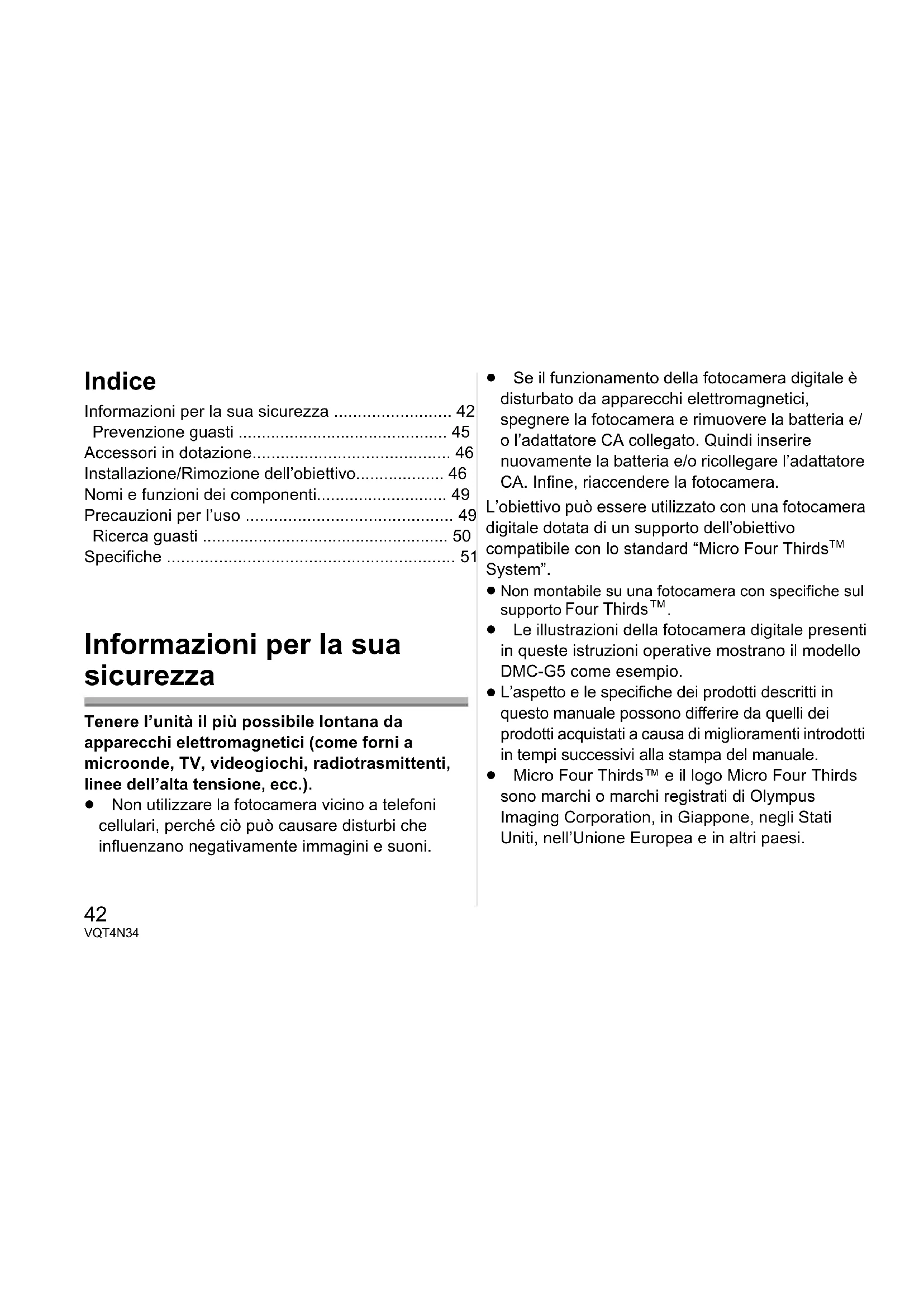 Quando si utilizzano fotocamere digitali Panasonic meno recenti (DMC-GF1, DMC-GH1, DMC-G1), [Stabilizz.] in modalità [Reg] non può essere impostato su [OFF]. Si consiglia di aggiornare il firmware della fotocamera digitale sul seguente sito Web. http://panasonic.jp/support/global/cs/dsc/download/ > Quando si utilizza questo obiettivo con fotocamere digitali di un’altra marca, contattare il rispettivo produttore per ulteriori informazioni. Ricerca guasti VQT4N34_E.book 50 ページ 2012年12月21日 金曜日 午後6時28分51 VQT4N34 Specifiche È possibile che le specifiche subiscano delle modifiche senza preavviso.