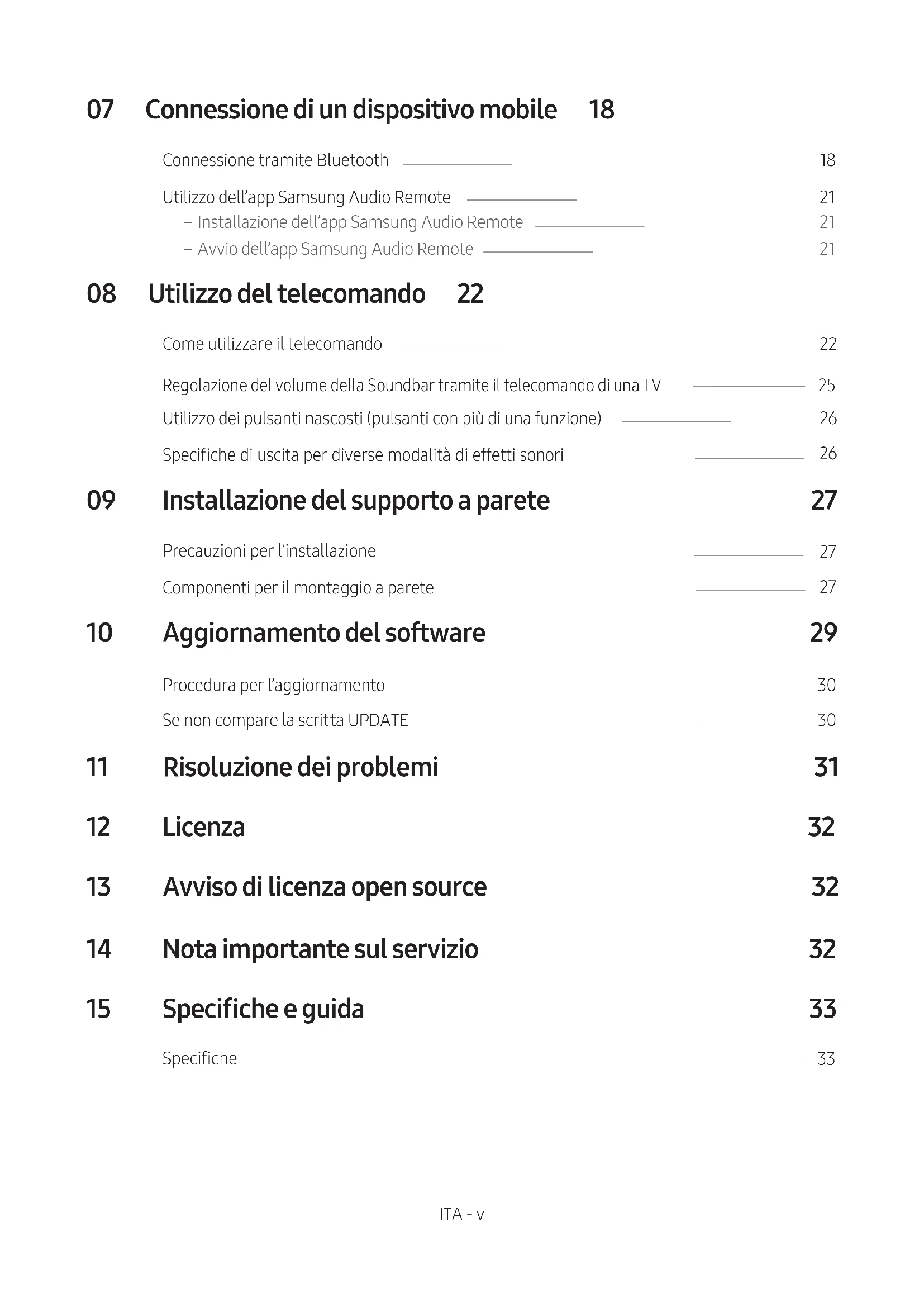 - L’aggiornamento tramite USB potrebbe non essere disponibile, a seconda del produttore del dispositivo di archiviazione.ITA - 31 11 RISOLUZIONEDEIPROBLEMI Prima di contattare l’assistenza, controllare quanto segue. L’unitànonsiaccende. Ilcavodialimentazioneècollegatoallapresa? ; Collegare la spina del cavo di alimentazione alla presa. Unafunzionenonrispondequandovienepremutoiltasto. Èpresenteelettricitàstaticanell’aria? ; Scollegare la spina del cavo di alimentazione e ricollegarla. Sivericanointerruzionidell’audionelmodoBT. ; Consultare le sezioni relative alla connessione Bluetooth, alle pagine 12 e 18. Nonvieneriprodottol’audio. LafunzioneMutoèattiva? ; Premere il tasto VOL per annullare la funzione. Ilvolumeèimpostatoalminimo? ; Regolare il volume. Iltelecomandononfunziona. Lebatteriesonoesaurite? ; Sostituirle con batterie nuove. Ladistanzatrailtelecomandoel’unitàprincipaledellaSoundbarètroppa? ; Avvicinare il telecomando all’unità principale della Soundbar. IlLEDrossosulsubwooferlampeggiaeilsubwoofernonemettealcunsuono. Ilproblemapuòvericarsiseilsubwoofernonècollegatoall’unitàprincipaledellaSoundbar. ; Provare a connettere nuovamente il subwoofer (consultare la pagina 6). Ilsubwooferemetteunronzioevibranotevolmente. Provarearegolarelevibrazionidelsubwoofer. ; Spingere il tasto WOOFER del telecomando verso l’alto o verso il basso per regolare il volume del subwoofer (su -12, oppure tra -6 ~ +6).ITA - 32 12 LICENZA Manufactured under license from Dolby Laboratories. Dolby, Dolby Audio, Pro Logic, and the double-D symbol are trademarks of Dolby Laboratories. For DTS patents, see http://patents.dts.com. Manufactured under license from DTS Licensing Limited. DTS, the Symbol, DTS in combination with the Symbol, and DTS 2.0 Channel are registered trademarks or trademarks of DTS, Inc. in the United States and/or other countries. © DTS, Inc. All Rights Reserved. The terms HDMI and HDMI High-Denition Multimedia Interface, and the HDMI Logo are trademarks or registered trademarks of HDMI Licensing LLC in the United States and other countries. 13 AVVISO DI LICENZA OPEN SOURCE Per inviare richieste e domande sulle open source, contattare Samsung tramite e-mail (oss.request@samsung.com). 14 NOTA IMPORTANTE SUL SERVIZIO