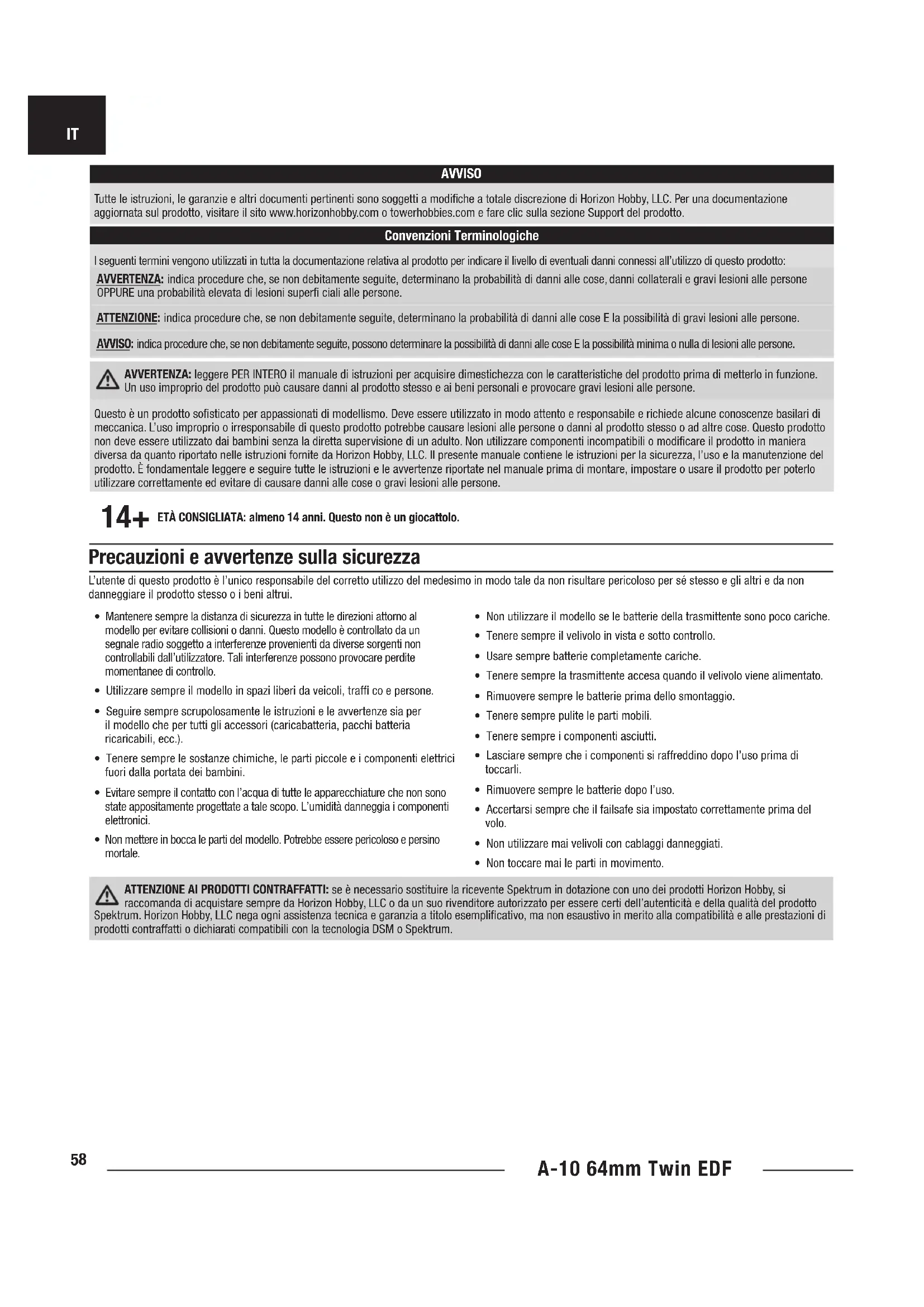 - Non toccare mai le parti in movimento. ATTENZIONE AI PRODOTTI CONTRAFFATTI: se è necessario sostituire la ricevente Spektrum in dotazione con uno dei prodotti Horizon Hobby, si raccomanda di acquistare sempre da Horizon Hobby, LLC o da un suo rivenditore autorizzato per essere certi dell’autenticità e della qualità del prodotto Spektrum. Horizon Hobby, LLC nega ogni assistenza tecnica e garanzia a titolo esempli cativo, ma non esaustivo in merito alla compatibilità e alle prestazioni di prodotti contraffatti o dichiarati compatibili con la tecnologia DSM o Spektrum. AVVISO Tutte le istruzioni, le garanzie e altri documenti pertinenti sono soggetti a modi che a totale discrezione di Horizon Hobby, LLC. Per una documentazione aggiornata sul prodotto, visitare il sito www.horizonhobby.com o towerhobbies.com e fare clic sulla sezione Support del prodotto. 14+ ETÀ CONSIGLIATA: almeno 14 anni. Questo non è un giocattolo. Convenzioni Terminologiche I seguenti termini vengono utilizzati in tutta la documentazione relativa al prodotto per indicare il livello di eventuali danni connessi all’utilizzo di questo prodotto: AVVERTENZA: indica procedure che, se non debitamente seguite, determinano la probabilità di danni alle cose, danni collaterali e gravi lesioni alle persone OPPURE una probabilità elevata di lesioni super ciali alle persone. ATTENZIONE: indica procedure che, se non debitamente seguite, determinano la probabilità di danni alle cose E la possibilità di gravi lesioni alle persone. AVVISO: indica procedure che, se non debitamente seguite, possono determinare la possibilità di danni alle cose E la possibilità minima o nulla di lesioni alle persone. AVVERTENZA: leggere PER INTERO il manuale di istruzioni per acquisire dimestichezza con le caratteristiche del prodotto prima di metterlo in funzione. Un uso improprio del prodotto può causare danni al prodotto stesso e ai beni personali e provocare gravi lesioni alle persone. Questo è un prodotto so sticato per appassionati di modellismo. Deve essere utilizzato in modo attento e responsabile e richiede alcune conoscenze basilari di meccanica. L’uso improprio o irresponsabile di questo prodotto potrebbe causare lesioni alle persone o danni al prodotto stesso o ad altre cose. Questo prodotto non deve essere utilizzato dai bambini senza la diretta supervisione di un adulto. Non utilizzare componenti incompatibili o modi care il prodotto in maniera diversa da quanto riportato nelle istruzioni fornite da Horizon Hobby, LLC. Il presente manuale contiene le istruzioni per la sicurezza, l’uso e la manutenzione del prodotto. È fondamentale leggere e seguire tutte le istruzioni e le avvertenze riportate nel manuale prima di montare, impostare o usare il prodotto per poterlo utilizzare correttamente ed evitare di causare danni alle cose o gravi lesioni alle persone.IT