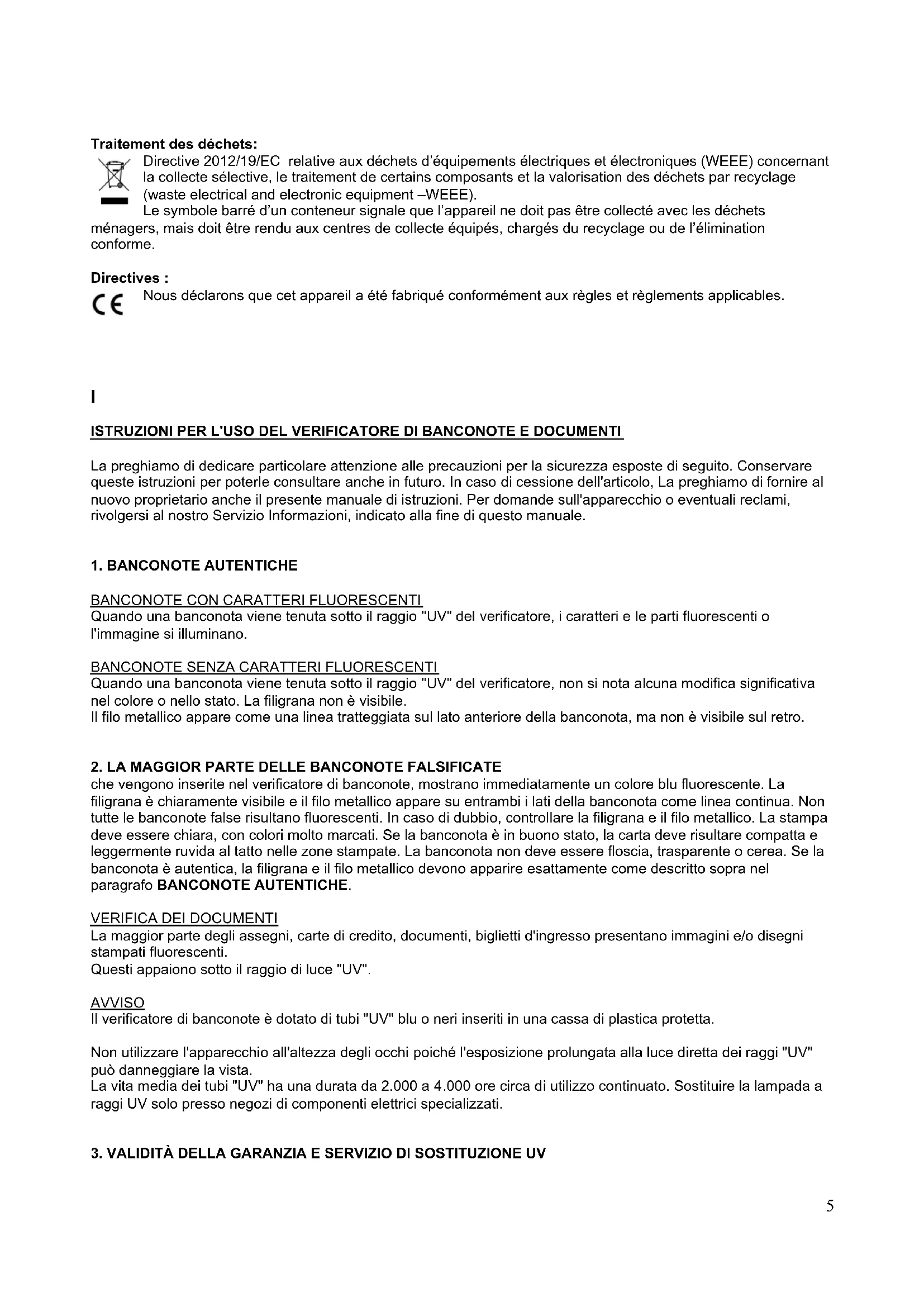 ISTRUZIONI PER L'USO DEL VERIFICATORE DI BANCONOTE E DOCUMENTI La preghiamo di dedicare particolare attenzione alle precauzioni per la sicurezza esposte di seguito. Conservare queste istruzioni per poterle consultare anche in futuro. In caso di cessione dell'articolo, La preghiamo di fornire al nuovo proprietario anche il presente manuale di istruzioni. Per domande sull'apparecchio o eventuali reclami, rivolgersi al nostro Servizio Informazioni, indicato alla fine di questo manuale.