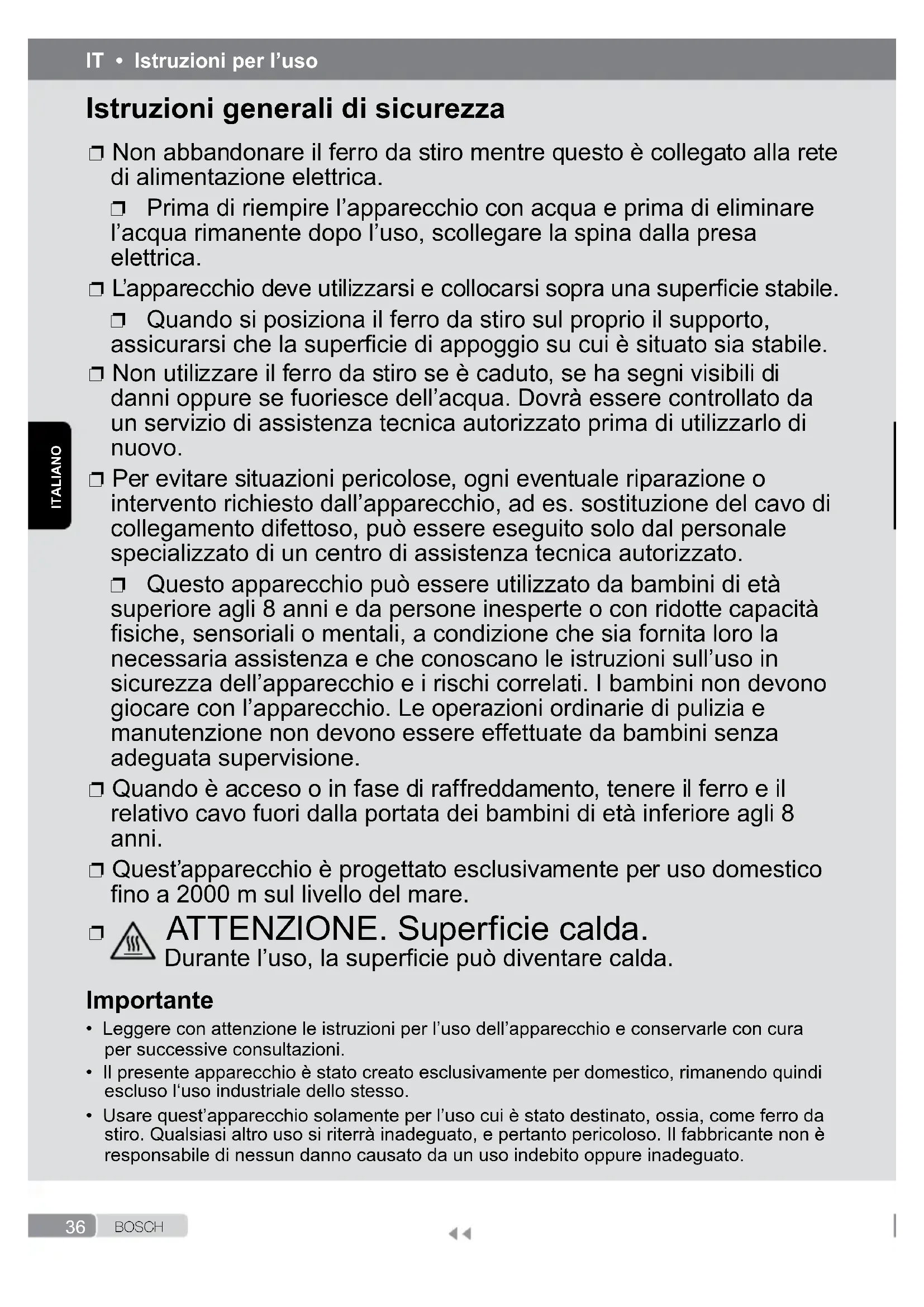 - Leggere con attenzione le istruzioni per l’uso dell’apparecchio e conservarle con cura per successive consultazioni.• Il presente apparecchio è stato creato esclusivamente per domestico, rimanendo quindi escluso l‘uso industriale dello stesso.• Usare quest’apparecchio solamente per l’uso cui è stato destinato, ossia, come ferro da stiro. Qualsiasi altro uso si riterrà inadeguato, e pertanto pericoloso. Il fabbricante non è responsabile di nessun danno causato da un uso indebito oppure inadeguato. Istruzioni generali di sicurezza ❐ Non abbandonare il ferro da stiro mentre questo è collegato alla rete di alimentazione elettrica. ❐ Prima di riempire l’apparecchio con acqua e prima di eliminare l’acqua rimanente dopo l’uso, scollegare la spina dalla presa elettrica. ❐ L’apparecchio deve utilizzarsi e collocarsi sopra una superficie stabile. ❐ Quando si posiziona il ferro da stiro sul proprio il supporto, assicurarsi che la superficie di appoggio su cui è situato sia stabile. ❐ Non utilizzare il ferro da stiro se è caduto, se ha segni visibili di danni oppure se fuoriesce dell’acqua. Dovrà essere controllato da un servizio di assistenza tecnica autorizzato prima di utilizzarlo di nuovo. ❐ Per evitare situazioni pericolose, ogni eventuale riparazione o intervento richiesto dall’apparecchio, ad es. sostituzione del cavo di collegamento difettoso, può essere eseguito solo dal personale specializzato di un centro di assistenza tecnica autorizzato. ❐ Questo apparecchio può essere utilizzato da bambini di età superiore agli 8 anni e da persone inesperte o con ridotte capacità fisiche, sensoriali o mentali, a condizione che sia fornita loro la necessaria assistenza e che conoscano le istruzioni sull’uso in sicurezza dell’apparecchio e i rischi correlati. I bambini non devono giocare con l’apparecchio. Le operazioni ordinarie di pulizia e manutenzione non devono essere effettuate da bambini senza adeguata supervisione. ❐ Quando è acceso o in fase di raffreddamento, tenere il ferro e il relativo cavo fuori dalla portata dei bambini di età inferiore agli 8 anni. ❐ Quest’apparecchio è progettato esclusivamente per uso domestico fino a 2000 m sul livello del mare. ❐ ATTENZIONE. Superficie calda. Durante l’uso, la superficie può diventare calda.37 B O S C H ITALIANO