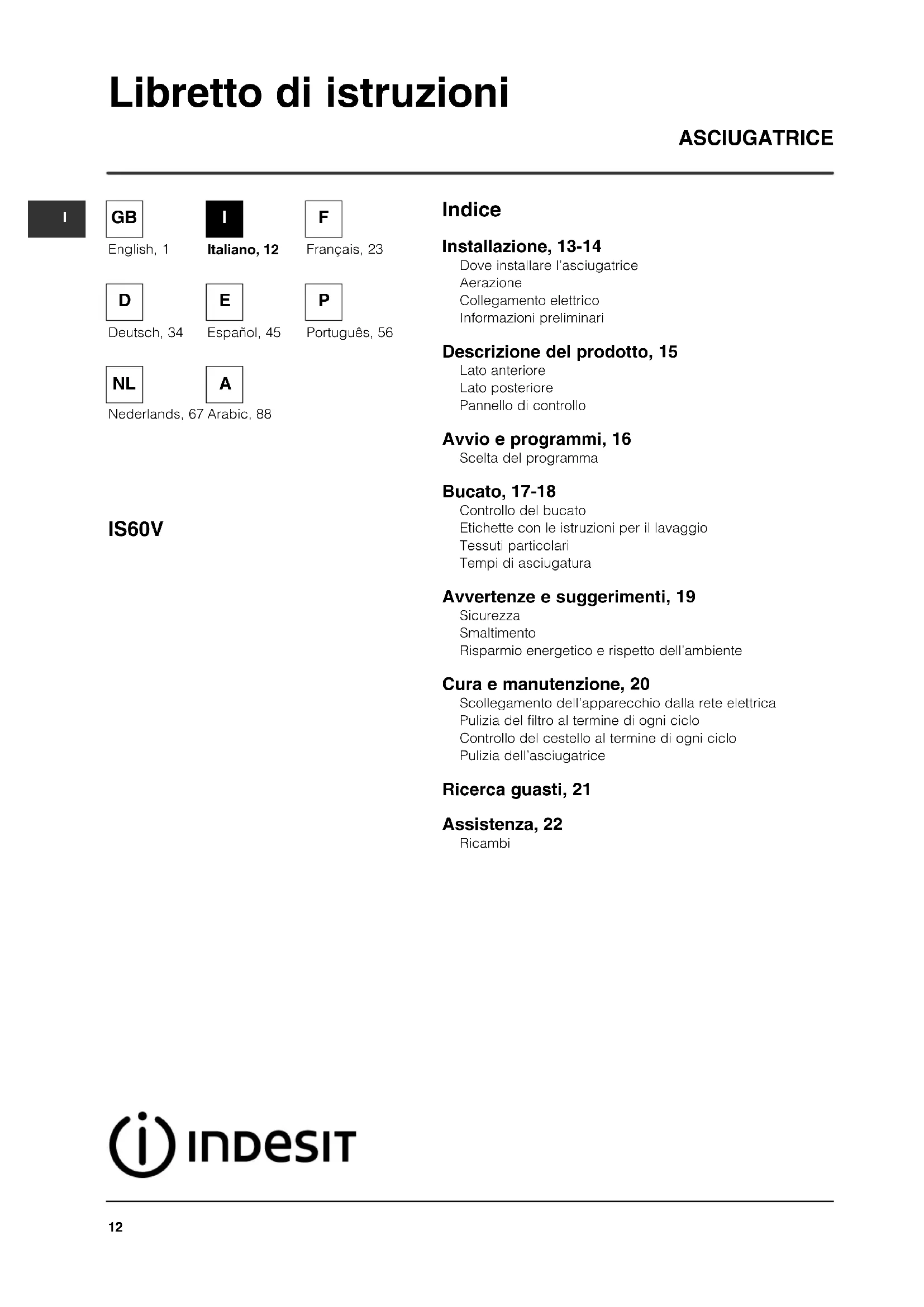 the serial number (S/N). This information can be found on the data label inside the door of the machine.Indice ASCIUGATRICE IS60V Libretto di istruzioni Installazione, 13-14 Dove installare l’asciugatrice Aerazione Collegamento elettrico Informazioni preliminari Descrizione del prodotto, 15 Lato anteriore Lato posteriore Pannello di controllo Avvio e programmi, 16 Scelta del programma Bucato, 17-18 Controllo del bucato Etichette con le istruzioni per il lavaggio Tessuti particolari Tempi di asciugatura Avvertenze e suggerimenti, 19 Sicurezza Smaltimento Risparmio energetico e rispetto dell’ambiente Cura e manutenzione, 20 Scollegamento dell’apparecchio dalla rete elettrica Pulizia del filtro al termine di ogni ciclo Controllo del cestello al termine di ogni ciclo Pulizia dell’asciugatrice Ricerca guasti, 21 Assistenza, 22 Ricambi