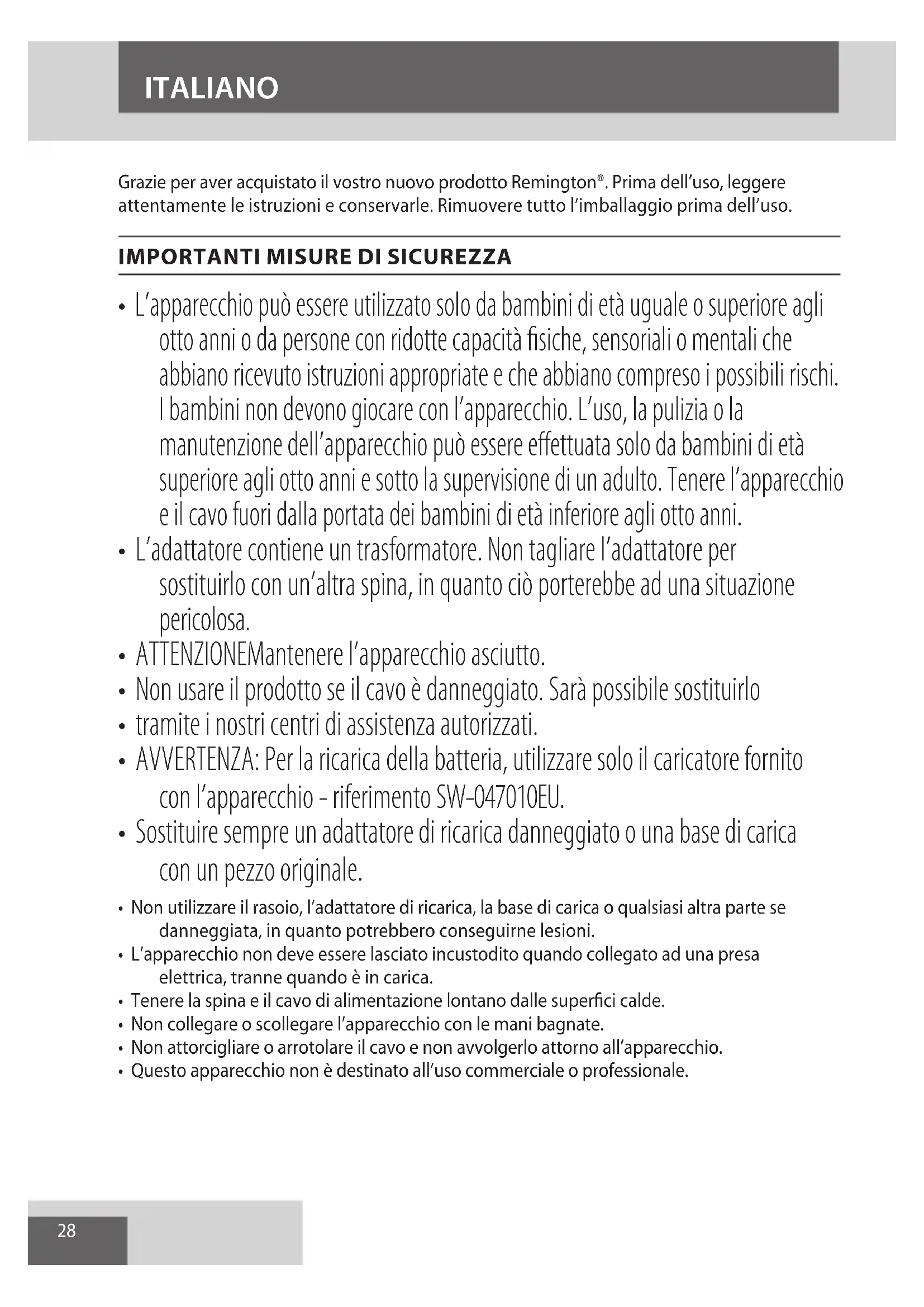 AE28 Grazie per aver acquistato il vostro nuovo prodotto Remington®. Prima dell’uso, leggere attentamente le istruzioni e conservarle. Rimuovere tutto l’imballaggio prima dell’uso.