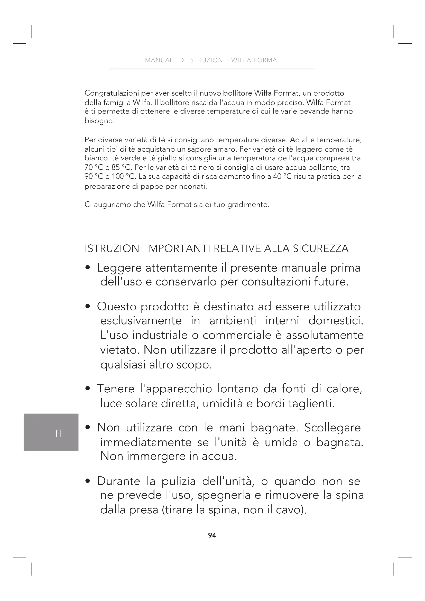 Congratulazioni per aver scelto il nuovo bollitore Wilfa Format, un prodotto della famiglia Wilfa. Il bollitore riscalda l'acqua in modo preciso. Wilfa Format è ti permette di ottenere le diverse temperature di cui le varie bevande hanno bisogno. Per diverse varietà di tè si consigliano temperature diverse. Ad alte temperature, alcuni tipi di tè acquistano un sapore amaro. Per varietà di tè leggero come tè bianco, tè verde e tè giallo si consiglia una temperatura dell'acqua compresa tra 70 °C e 85 °C. Per le varietà di tè nero si consiglia di usare acqua bollente, tra 90 °C e 100 °C. La sua capacità di riscaldamento no a 40 °C risulta pratica per la preparazione di pappe per neonati. Ci auguriamo che Wilfa Format sia di tuo gradimento.