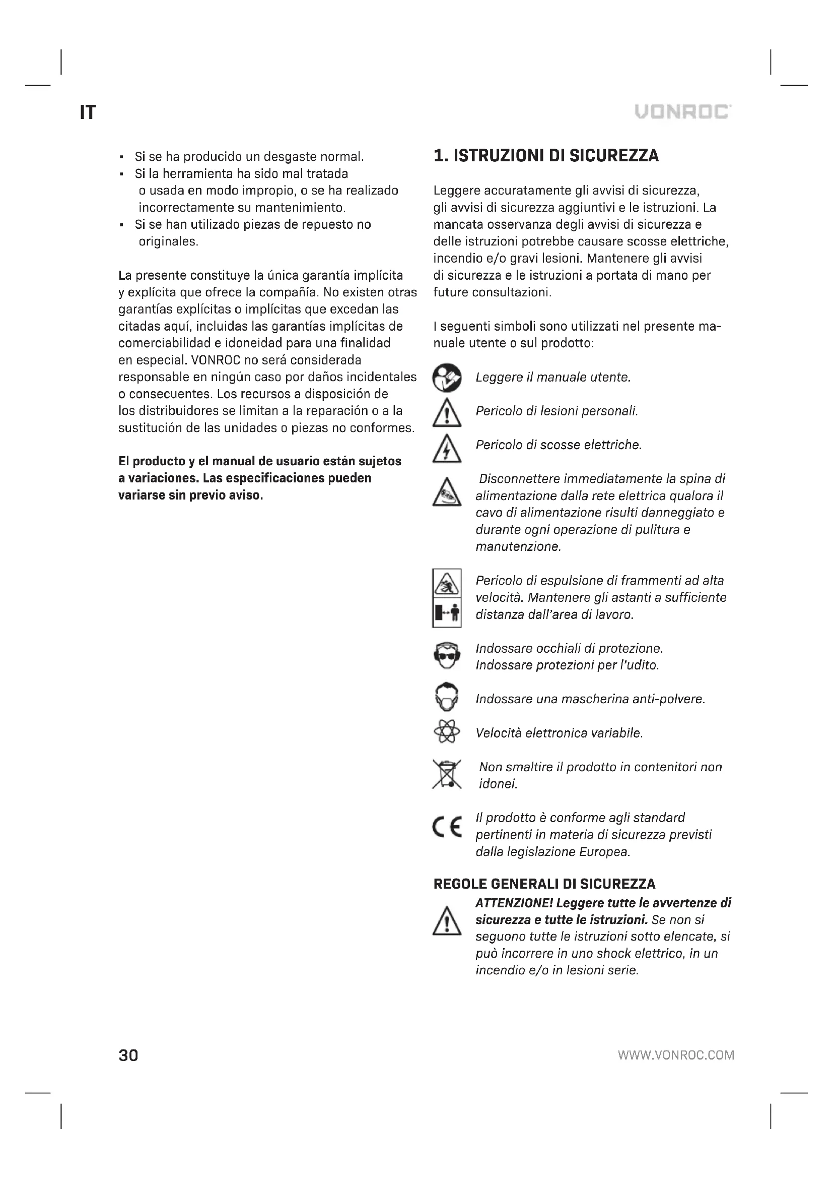 - Sono state utilizzate parti di ricambio non originali Ciò costituisce l’unica garanzia espressa oimplicita fornita dall’azienda. Non esistono altre garanzie espresse oimplicite che si estendono oltre il presente documento, ivi comprese le garanzie implicite di commerciabilità eidoneità per uno scopo particolare. In nessun caso VONROC sarà responsabile di eventuali danni incidentali oconsequenziali. Irimedi dei rivenditori saranno limitati alla riparazione osostituzione di unità oparti non conformi. Il prodotto eil manuale per l’utente sono soggetti amodifiche. Idati tecnici possono essere modificati senza ulteriore notifica.36