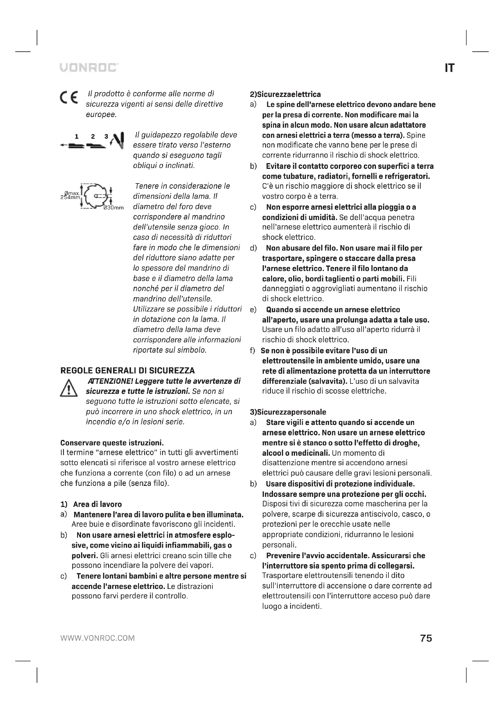 a) Non forzare l’arnese elettrico. Usare l’arnese elettrico corretto per il vostro impiego. L’arnese elettrico corretto farà il lavoro meglio e in maniera più sicura alla velocità per la quale è stato progettato. b) Non usare l’arnese elettrico se l’interruttore non si accende o non si spegne. Ogni arnese elettrico che non può essere controllato con l’interruttore è pericoloso e deve essere riparato. c) Scollegare la spina dalla sorgente di elettricità prima di fare qualsiasi regolazione, cambiare gli accessori, o conservare arnesi elettrici. Tali misure di sicurezza preventive riducono il rischio di accendere l’arnese elettrico accidentalmente. d) Conservare gli arnesi elettrici inattivi fuori dalla portata dei bambini e non permettere a persone che non hanno confidenza con l’arnese elettrico o con queste istruzioni di usare l’arnese elettrico. Gli arnesi elettrici sono pericolosi per utenti inesperti. e) Mantenere gli arnesi elettrici. Controllare il non allineamento o l’attacco di parti mobili, la rottura di parti ed ogni altra condizione che può influire sul funzionamento degli arnesi elettrici. Se è danneggiato, far riparare l’arnese elettrico prima dell’uso. Molti incidenti sono causati da arnesi elettrici mantenuti male. f) Mantenere gli arnesi da taglio affilati e puliti. È meno probabile che si attacchino degli arnesi da taglio mantenuti correttamente con tagli affilate e questi sono anche più facili da controllare. g) Usare l’arnese elettrico, gli accessori e le parti dell’arnese ecc, secondo queste istruzioni e nel modo pensato per il particolare tipo di arnese elettrico, tenendo conto delle condizioni di lavoro e del lavoro da svolgere. L’uso dell’arnese elettrico per operazioni diverse da quelle pensate potrebbe causare situazioni pericolose. h) Mantenere le impugnature e le superfici di presa asciutte, pulite e libere da olio e grasso. Impugnature e superfici di presa scivolose non consentono di maneggiare e controllare in sicu- rezza l’utensile in situazioni impreviste.