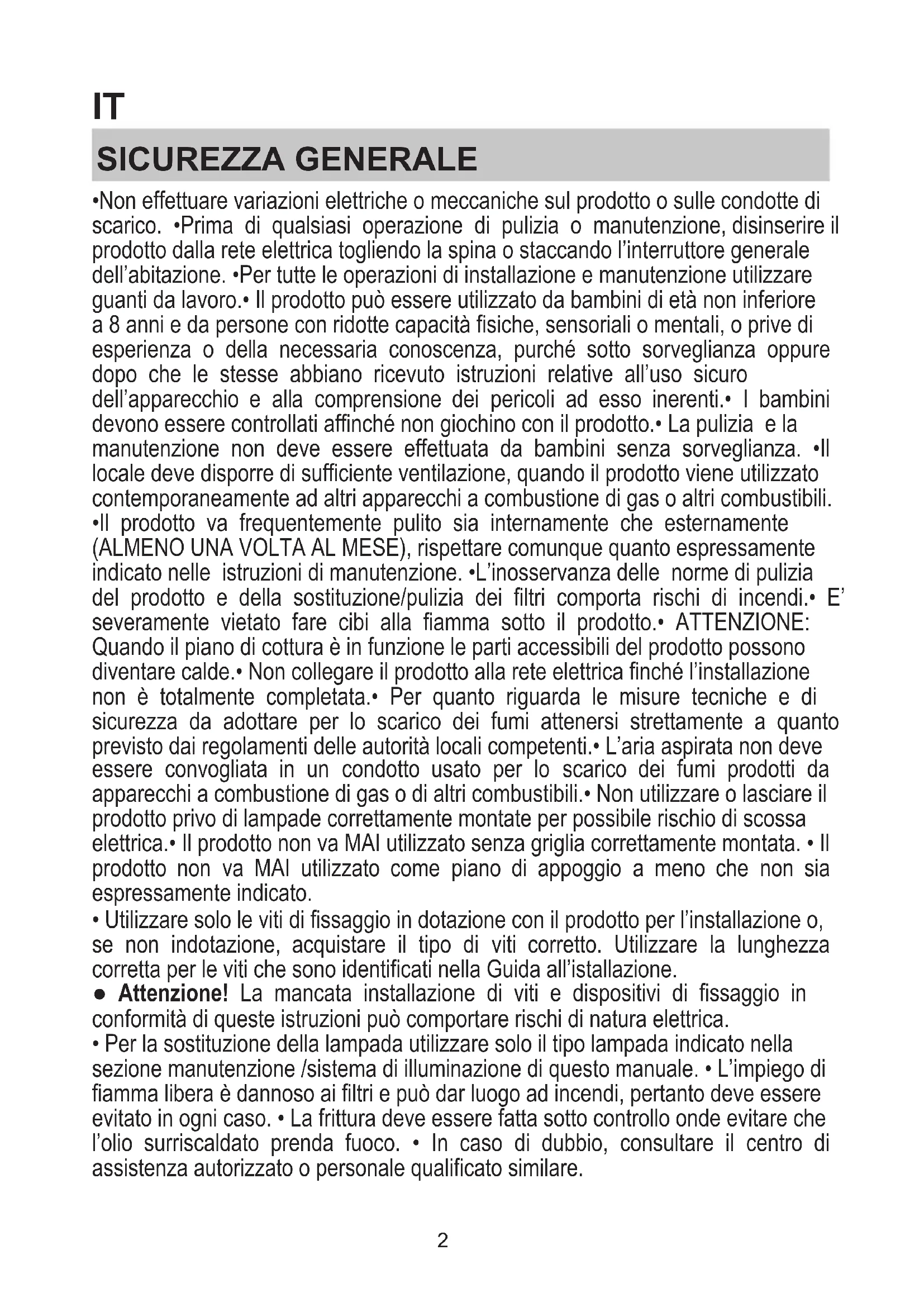 - Il prodotto va frequentemente pulito sia internamente che esternamente (ALMENO UNA VOLTA AL MESE), rispettare comunque quanto espressamente indicato nelle istruzioni di manutenzione. •L’inosservanza delle norme di pulizia del prodotto e della sostituzione/pulizia dei filtri comporta rischi di incendi.• E’ severamente vietato fare cibi alla fiamma sotto il prodotto.• ATTENZIONE: Quando il piano di cottura è in funzione le parti accessibili del prodotto possono diventare calde.• Non collegare il prodotto alla rete elettrica finché l’installazione non è totalmente completata.• Per quanto riguarda le misure tecniche e di sicurezza da adottare per lo scarico dei fumi attenersi strettamente a quanto previsto dai regolamenti delle autorità locali competenti.• L’aria aspirata non deve essere convogliata in un condotto usato per lo scarico dei fumi prodotti da apparecchi a combustione di gas o di altri combustibili.• Non utilizzare o lasciare il prodotto privo di lampade correttamente montate per possibile rischio di scossa elettrica.• Il prodotto non va MAI utilizzato senza griglia correttamente montata. • Il prodotto non va MAI utilizzato come piano di appoggio a meno che non sia espressamente indicato.