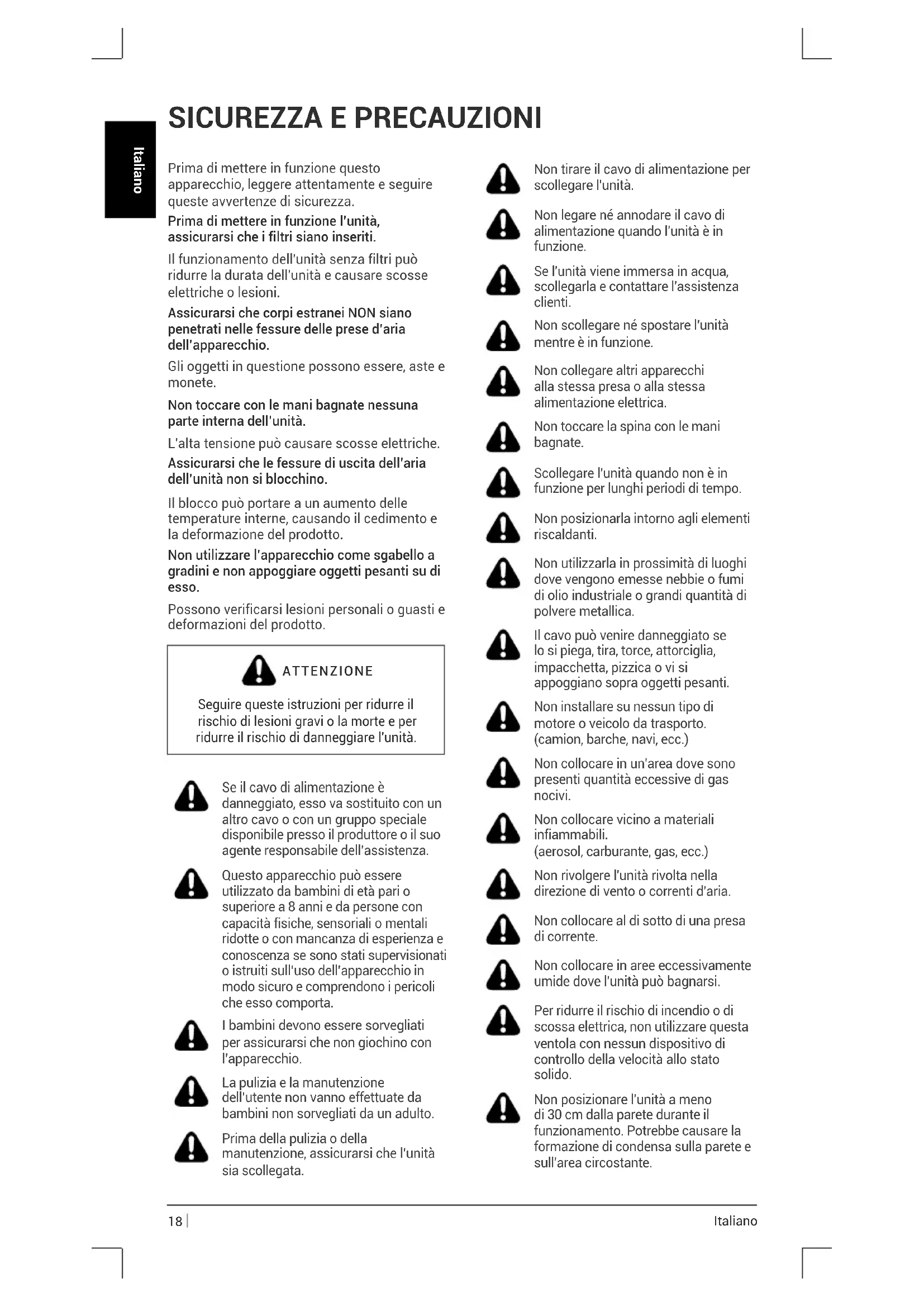 Prima di mettere in funzione questo apparecchio, leggere attentamente e seguire queste avvertenze di sicurezza. Prima di mettere in funzione l’unità, assicurarsi che i filtri siano inseriti. Il funzionamento dell'unità senza filtri può ridurre la durata dell'unità e causare scosse elettriche o lesioni. Assicurarsi che corpi estranei NON siano penetrati nelle fessure delle prese d’aria dell’apparecchio. Gli oggetti in questione possono essere, aste e monete. Non toccare con le mani bagnate nessuna parte interna dell’unità. L'alta tensione può causare scosse elettriche. Assicurarsi che le fessure di uscita dell’aria dell’unità non si blocchino. Il blocco può portare a un aumento delle temperature interne, causando il cedimento e la deformazione del prodotto. Non utilizzare l’apparecchio come sgabello a gradini e non appoggiare oggetti pesanti su di esso. Possono verificarsi lesioni personali o guasti e deformazioni del prodotto. ATTENZIONE Seguire queste istruzioni per ridurre il rischio di lesioni gravi o la morte e per ridurre il rischio di danneggiare l'unità. Se il cavo di alimentazione è danneggiato, esso va sostituito con un altro cavo o con un gruppo speciale disponibile presso il produttore o il suo agente responsabile dell’assistenza. Questo apparecchio può essere utilizzato da bambini di età pari o superiore a 8 anni e da persone con capacità fisiche, sensoriali o mentali ridotte o con mancanza di esperienza e conoscenza se sono stati supervisionati o istruiti sull’uso dell’apparecchio in modo sicuro e comprendono i pericoli che esso comporta. I bambini devono essere sorvegliati per assicurarsi che non giochino con l’apparecchio. La pulizia e la manutenzione dell’utente non vanno effettuate da bambini non sorvegliati da un adulto. Prima della pulizia o della manutenzione, assicurarsi che l’unità sia scollegata. Non tirare il cavo di alimentazione per scollegare l'unità. Non legare né annodare il cavo di alimentazione quando l'unità è in funzione. Se l'unità viene immersa in acqua, scollegarla e contattare l'assistenza clienti. Non scollegare né spostare l'unità mentre è in funzione. Non collegare altri apparecchi alla stessa presa o alla stessa alimentazione elettrica. Non toccare la spina con le mani bagnate. Scollegare l'unità quando non è in funzione per lunghi periodi di tempo. Non posizionarla intorno agli elementi riscaldanti. Non utilizzarla in prossimità di luoghi dove vengono emesse nebbie o fumi di olio industriale o grandi quantità di polvere metallica. Il cavo può venire danneggiato se lo si piega, tira, torce, attorciglia, impacchetta, pizzica o vi si appoggiano sopra oggetti pesanti. Non installare su nessun tipo di motore o veicolo da trasporto. (camion, barche, navi, ecc.) Non collocare in un'area dove sono presenti quantità eccessive di gas nocivi. Non collocare vicino a materiali infiammabili. (aerosol, carburante, gas, ecc.) Non rivolgere l'unità rivolta nella direzione di vento o correnti d'aria. Non collocare al di sotto di una presa di corrente. Non collocare in aree eccessivamente umide dove l'unità può bagnarsi. Per ridurre il rischio di incendio o di scossa elettrica, non utilizzare questa ventola con nessun dispositivo di controllo della velocità allo stato solido. Non posizionare l'unità a meno di 30 cm dalla parete durante il funzionamento. Potrebbe causare la formazione di condensa sulla parete e sull'area circostante. SICUREZZA E PRECAUZIONIItaliano Italiano