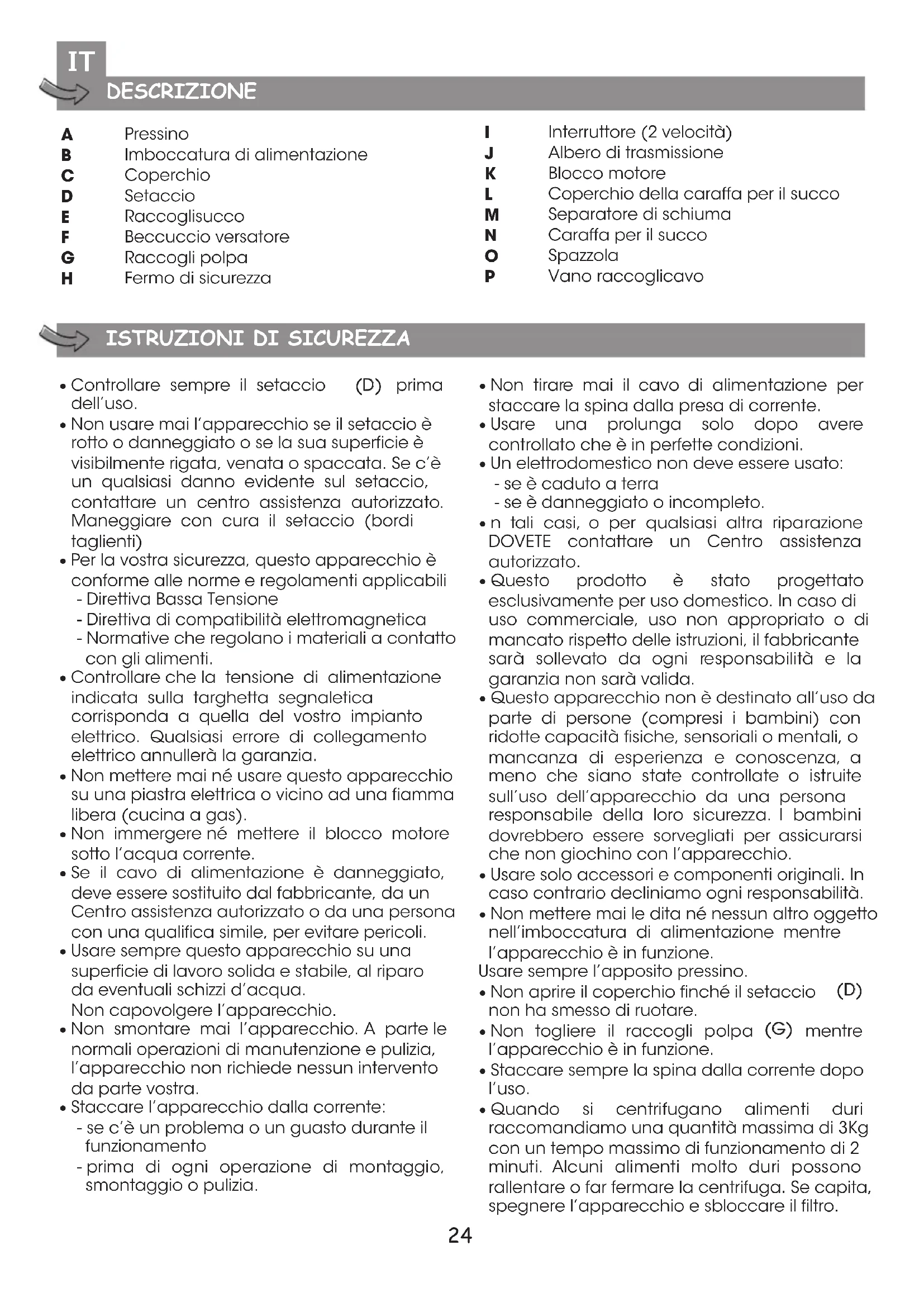 - Quando si centrifugano alimenti duri raccomandiamo una quantità massima di 3Kg con un tempo massimo di funzionamento di 2 minuti. Alcuni alimenti molto duri possono rallentare o far fermare la centrifuga. Se capita, spegnere l’apparecchio e sbloccare il filtro. IT25