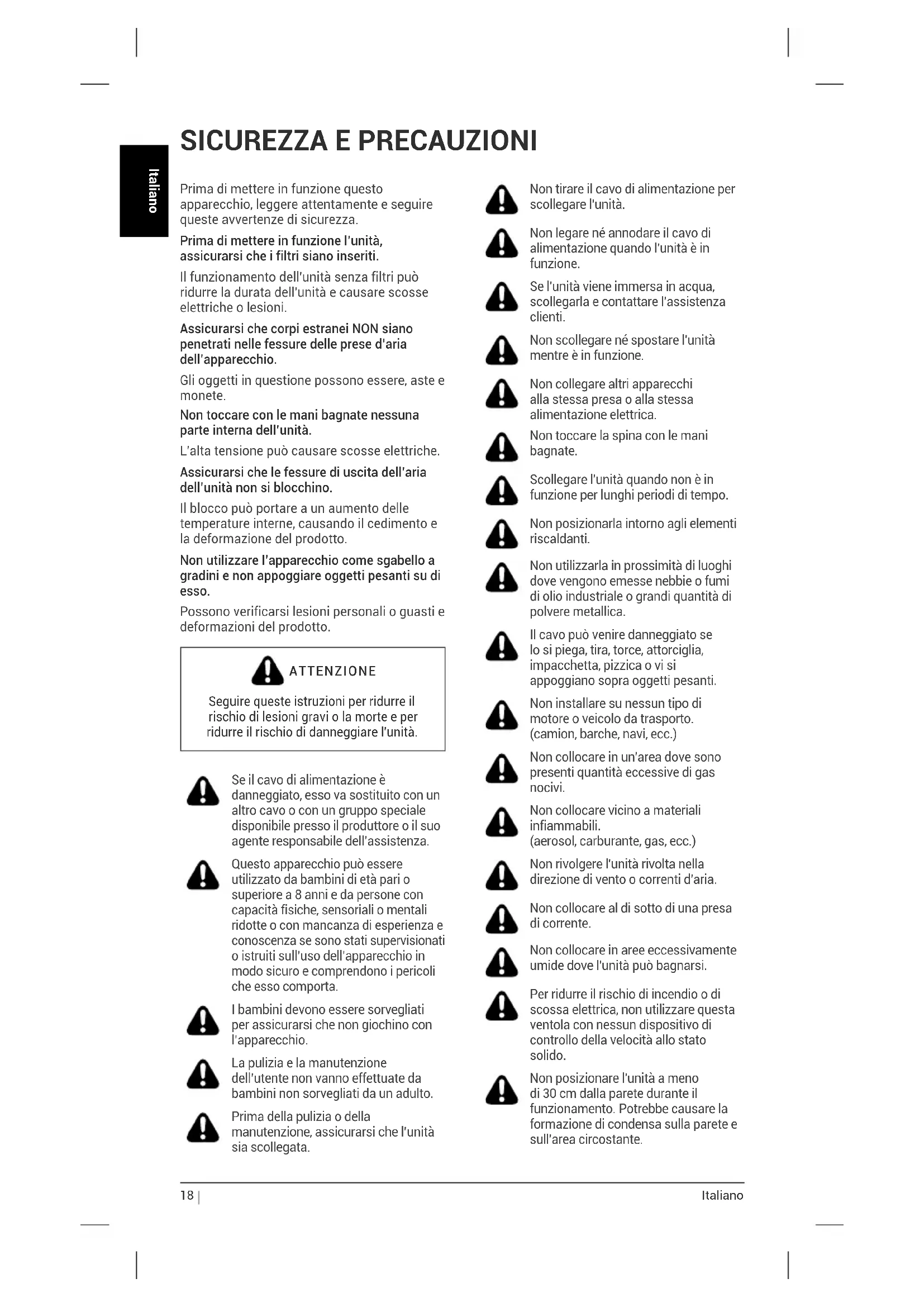 Prima di mettere in funzione questo apparecchio, leggere attentamente e seguire queste avvertenze di sicurezza. Prima di mettere in funzione l’unità, assicurarsi che i filtri siano inseriti. Il funzionamento dell'unità senza filtri può ridurre la durata dell'unità e causare scosse elettriche o lesioni. Assicurarsi che corpi estranei NON siano penetrati nelle fessure delle prese d’aria dell’apparecchio. Gli oggetti in questione possono essere, aste e monete. Non toccare con le mani bagnate nessuna parte interna dell’unità. L'alta tensione può causare scosse elettriche. Assicurarsi che le fessure di uscita dell’aria dell’unità non si blocchino. Il blocco può portare a un aumento delle temperature interne, causando il cedimento e la deformazione del prodotto. Non utilizzare l’apparecchio come sgabello a gradini e non appoggiare oggetti pesanti su di esso. Possono verificarsi lesioni personali o guasti e deformazioni del prodotto. ATTENZIONE Seguire queste istruzioni per ridurre il rischio di lesioni gravi o la morte e per ridurre il rischio di danneggiare l'unità. Se il cavo di alimentazione è danneggiato, esso va sostituito con un altro cavo o con un gruppo speciale disponibile presso il produttore o il suo agente responsabile dell’assistenza. Questo apparecchio può essere utilizzato da bambini di età pari o superiore a 8 anni e da persone con capacità fisiche, sensoriali o mentali ridotte o con mancanza di esperienza e conoscenza se sono stati supervisionati o istruiti sull’uso dell’apparecchio in modo sicuro e comprendono i pericoli che esso comporta. I bambini devono essere sorvegliati per assicurarsi che non giochino con l’apparecchio. La pulizia e la manutenzione dell’utente non vanno effettuate da bambini non sorvegliati da un adulto. Prima della pulizia o della manutenzione, assicurarsi che l’unità sia scollegata. Non tirare il cavo di alimentazione per scollegare l'unità. Non legare né annodare il cavo di alimentazione quando l'unità è in funzione. Se l'unità viene immersa in acqua, scollegarla e contattare l'assistenza clienti. Non scollegare né spostare l'unità mentre è in funzione. Non collegare altri apparecchi alla stessa presa o alla stessa alimentazione elettrica. Non toccare la spina con le mani bagnate. Scollegare l'unità quando non è in funzione per lunghi periodi di tempo. Non posizionarla intorno agli elementi riscaldanti. Non utilizzarla in prossimità di luoghi dove vengono emesse nebbie o fumi di olio industriale o grandi quantità di polvere metallica. Il cavo può venire danneggiato se lo si piega, tira, torce, attorciglia, impacchetta, pizzica o vi si appoggiano sopra oggetti pesanti. Non installare su nessun tipo di motore o veicolo da trasporto. (camion, barche, navi, ecc.) Non collocare in un'area dove sono presenti quantità eccessive di gas nocivi. Non collocare vicino a materiali infiammabili. (aerosol, carburante, gas, ecc.) Non rivolgere l'unità rivolta nella direzione di vento o correnti d'aria. Non collocare al di sotto di una presa di corrente. Non collocare in aree eccessivamente umide dove l'unità può bagnarsi. Per ridurre il rischio di incendio o di scossa elettrica, non utilizzare questa ventola con nessun dispositivo di controllo della velocità allo stato solido. Non posizionare l'unità a meno di 30 cm dalla parete durante il funzionamento. Potrebbe causare la formazione di condensa sulla parete e sull'area circostante. SICUREZZA E PRECAUZIONIItaliano Italiano