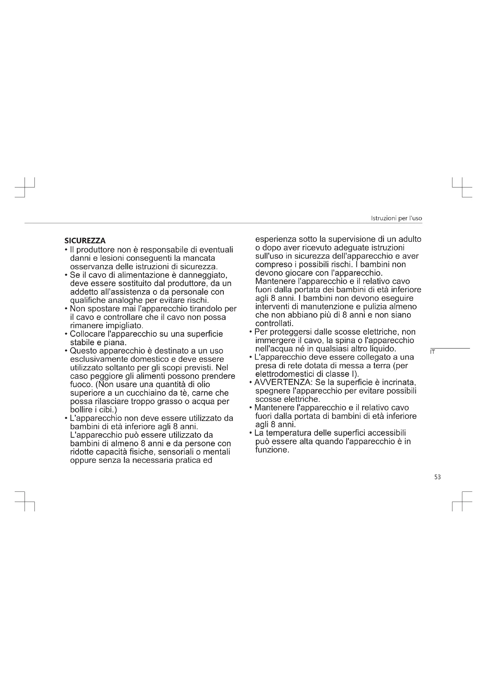 - L'apparecchio non deve essere utilizzato da bambini di età inferiore agli 8 anni. L'apparecchio può essere utilizzato da bambini di almeno 8 anni e da persone con ridotte capacità fisiche, sensoriali o mentali oppure senza la necessaria pratica ed esperienza sotto la supervisione di un adulto o dopo aver ricevuto adeguate istruzioni sull'uso in sicurezza dell'apparecchio e aver compreso i possibili rischi. I bambini non devono giocare con l'apparecchio. Mantenere l'apparecchio e il relativo cavo fuori dalla portata dei bambini di età inferiore agli 8 anni. I bambini non devono eseguire interventi di manutenzione e pulizia almeno che non abbiano più di 8 anni e non siano controllati.