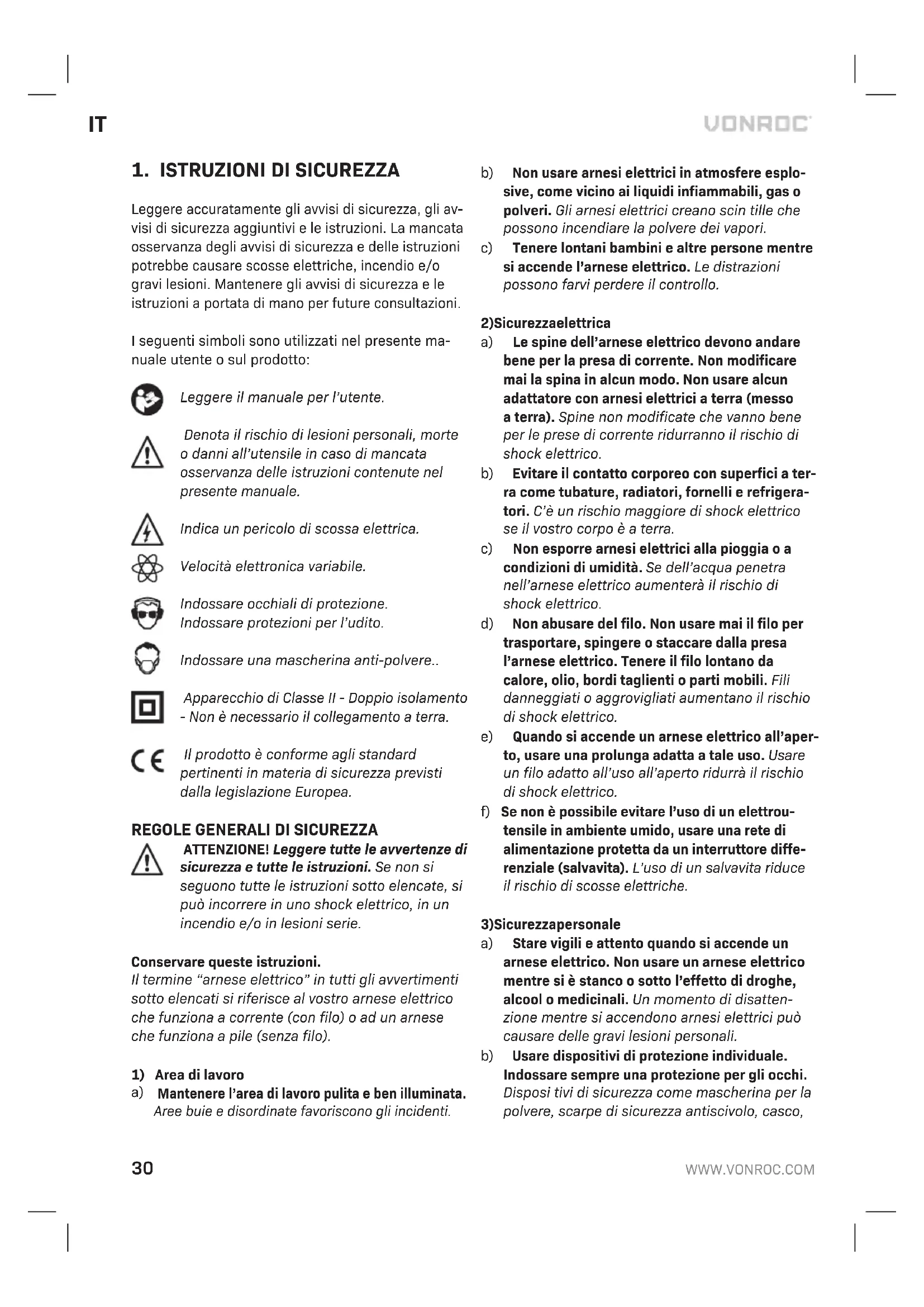 - Sono state utilizzate parti di ricambio non origi- nali Ciò costituisce l’unica garanzia espressa o implicita fornita dall’azienda. Non esistono altre garanzie espresse o implicite che si estendono oltre il presente documento, ivi comprese le garanzie im- plicite di commerciabilità e idoneità per uno scopo particolare. In nessun caso VONROC sarà responsa- bile di eventuali danni incidentali o consequenziali. I rimedi dei rivenditori saranno limitati alla ripara- zione o sostituzione di unità o parti non conformi. Il prodotto e il manuale per l’utente sono soggetti a modifiche. I dati tecnici possono essere modificati senza ulteriore notifica.
