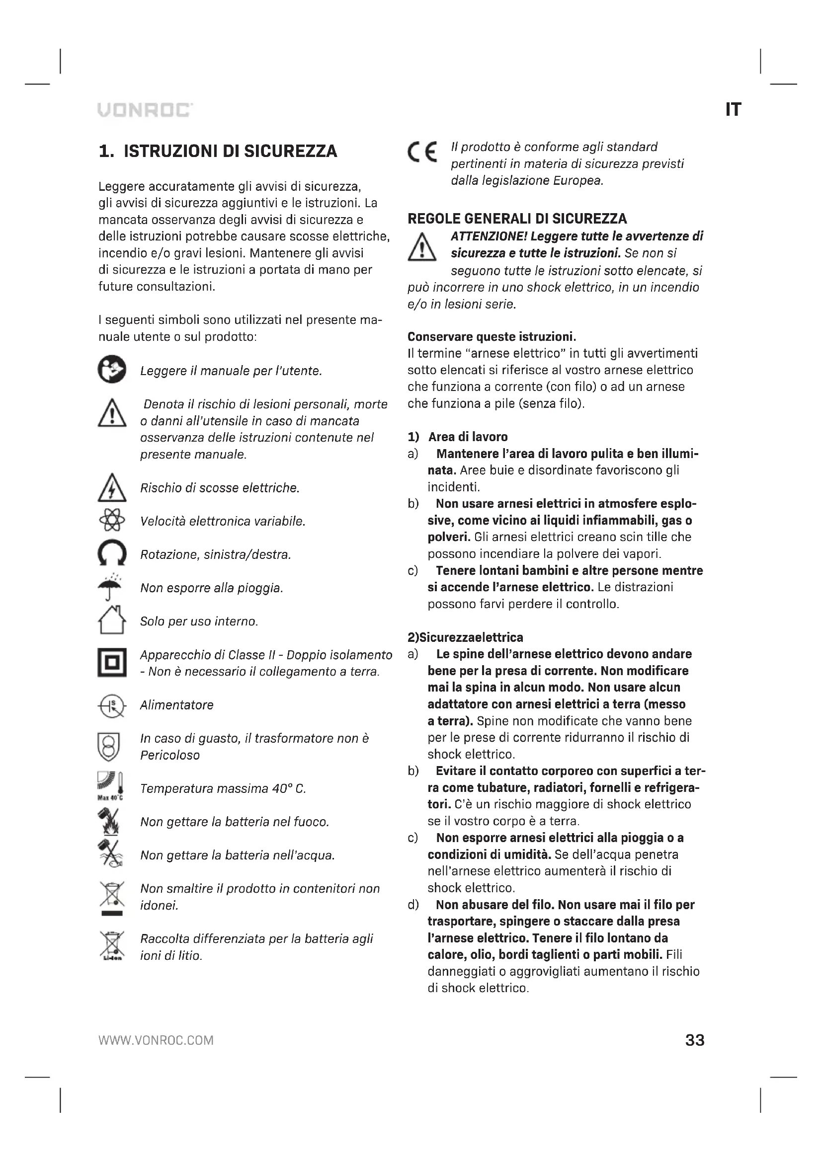 - Sono state utilizzate parti di ricambio non origi- nali. Ciò costituisce l’unica garanzia espressa o implicita fornita dall’azienda. Non esistono altre garanzie es- presse o implicite che si estendono oltre il presente documento, ivi comprese le garanzie implicite di commerciabilità e idoneità per uno scopo particola- re. In nessun caso VONROC sarà responsabile di eventuali danni incidentali o consequenziali. I rime- di dei rivenditori saranno limitati alla riparazione o sostituzione di unità o parti non conformi. Il prodotto e il manuale per l’utente sono soggetti a modifiche. I dati tecnici possono essere modificati senza ulteriore notifica.PL