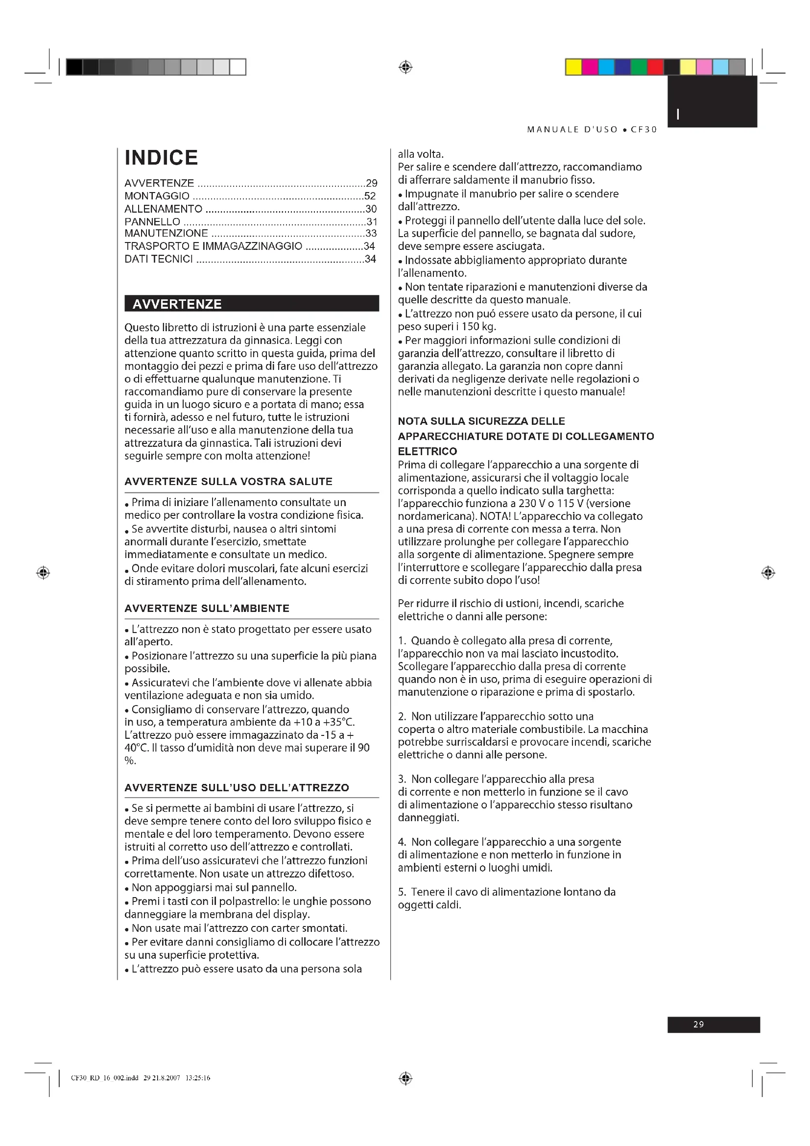 MANUALE D'USO CF30 AVVERTENzE Questo libretto di istruzioni è una parte essenziale della tua attrezzatura da ginnasica. Leggi con attenzione quanto scritto in questa guida, prima del montaggio dei pezzi e prima di fare uso dell’attrezzo o di effettuarne qualunque manutenzione. Ti raccomandiamo pure di conservare la presente guida in un luogo sicuro e a portata di mano; essa ti fornirà, adesso e nel futuro, tutte le istruzioni necessarie all’uso e alla manutenzione della tua attrezzatura da ginnastica. Tali istruzioni devi seguirle sempre con molta attenzione! AVVERTENzE SULLA VOSTRA SALUTE