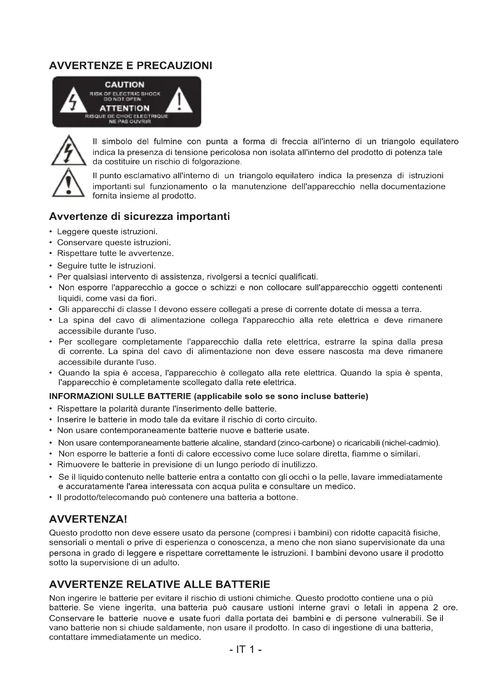 - Il prodotto/telecomando può contenere una batteria a bottone. AVVERTENZA! Questo prodotto non deve essere usato da persone (compresi i bambini) con ridotte capacità siche, sensoriali o mentali o prive di esperienza o conoscenza, a meno che non siano supervisionate da una persona in grado di leggere e rispettare correttamente le istruzioni. I bambini devono usare il prodotto sotto la supervisione di un adulto.