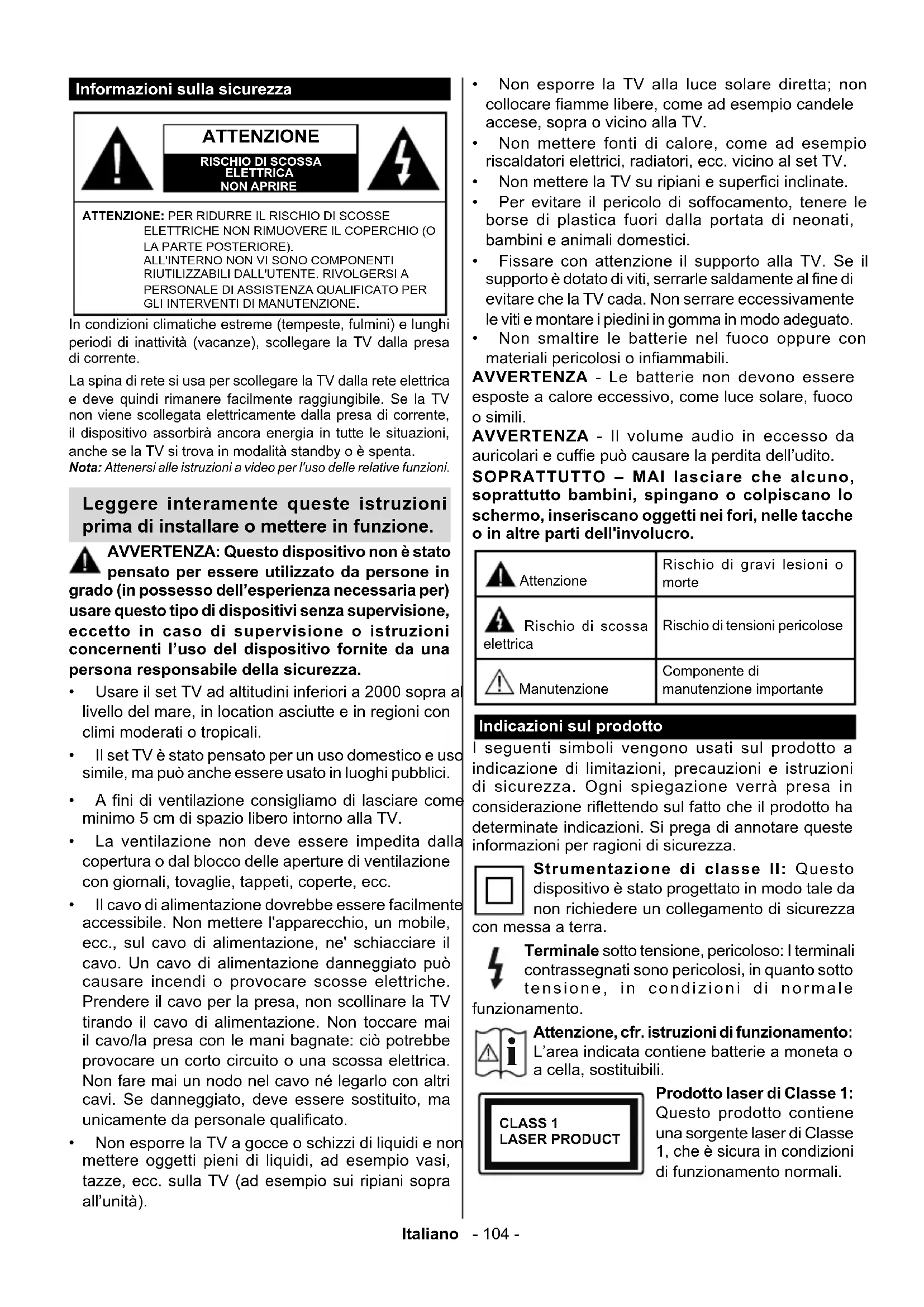 Attenzione, cfr. istruzioni di funzionamento: L’area indicata contiene batterie a moneta o a cella, sostituibili. CLASS 1 LASER PRODUCT Prodotto laser di Classe 1: Questo prodotto contiene una sorgente laser di Classe 1, che è sicura in condizioni di funzionamento normali.Italiano - 105 - AVVERTENZA Non ingerire batterie, pericolo di esplosione chimica. Il prodotto o gli accessori forniti in dotazione col prodotto potrebbero contenere una batteria a moneta/bottone. Se la batteria a cella, modello moneta/bottone viene ingoiata, può causare gravi lesioni interne in sole 2 ore e può portare al decesso. Tenere lontano dalla portata dei bambini batterie nuove e batterie usate. Se lo scomparto batterie non si chiude in modo sicuro, smettere di usare il prodotto e tenerlo lontano dalla portata dei bambini. Qualora si ritenga che le batterie vengano ingoiate o collocate all'interno del corpo, rivolgersi immediatamente a un medico. – – – – – – – – – – – – Non collocare mai il set TV in una posizione instabile o inclinata. La TV potrebbe cadere, causando gravi lesioni personali o morte. Molte lesioni, in particolare ai bambini, possono essere evitate prendendo facili precauzioni, quali ad esempio:
