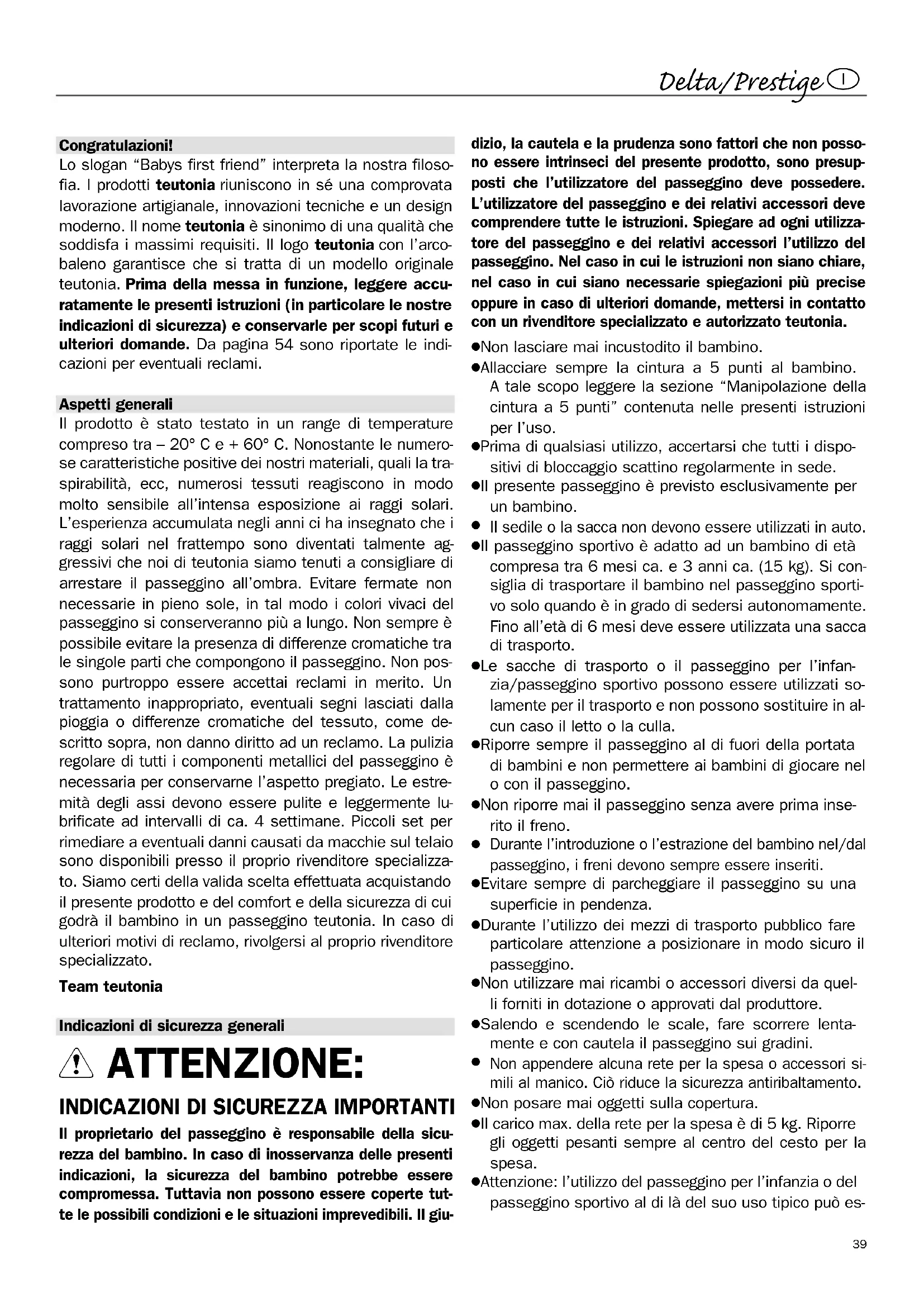 Non appendere alcuna rete per la spesa o accessori si- mili al manico. Ciò riduce la sicurezza antiribaltamento. ● Non posare mai oggetti sulla copertura. ● Il carico max. della rete per la spesa è di 5 kg. Riporre gli oggetti pesanti sempre al centro del cesto per la spesa. ● Attenzione: l’utilizzo del passeggino per l’infanzia o del passeggino sportivo al di là del suo uso tipico può es- 39i Delta/Prestige sere pericoloso. Il presente prodotto non è adatto per jogging, corsa, skating o attività simili. ● Durante l’apertura e la chiusura del telaio fare atten- zione a non incastrare se stessi o altre persone.