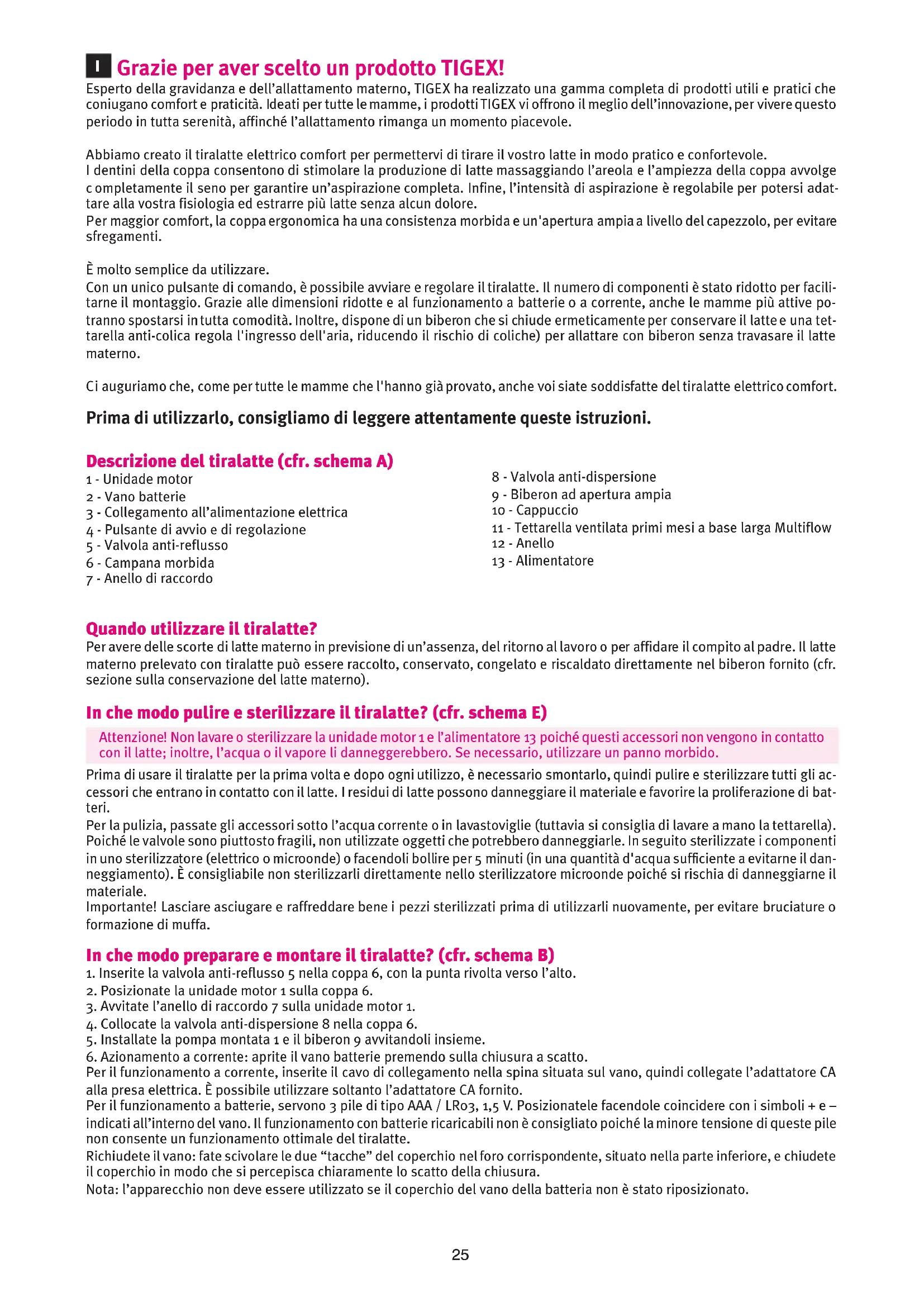 - De speen met brede basis Tigex wordt gebruikt met de zuigflessen brede basis Tigex INTUTION ou MULTIFLOW Garantie De voedingskabel en de connector zijn uitgesloten van garantie. 2 jaar garantie Stuur een kopie van uw aankoopbon, voornaam en adres op ongezegeld papier, en het defecte product aan uw leverancier of : ALLEGRE PUERICULTURE Service consommateur 41 rue Edouard Martel 42000 Saint-Etienne FRANCE NOTICE TIRE LAIT ELECT MULTIFLOW_Mise en page 1 11/08/17 11:36 Page242525 Quando utilizzare il tiralatte? Per avere delle scorte di latte materno in previsione di un’assenza, del ritorno al lavoro o per affidare il compito al padre. Il latte materno prelevato con tiralatte può essere raccolto, conservato, congelato e riscaldato direttamente nel biberon fornito (cfr. sezione sulla conservazione del latte materno). In che modo pulire e sterilizzare il tiralatte? (cfr. schema E) Attenzione! Non lavare o sterilizzare la unidade motor 1 e l’alimentatore 13 poiché questi accessori non vengono in contatto con il latte; inoltre, l’acqua o il vapore li danneggerebbero. Se necessario, utilizzare un panno morbido. Prima di usare il tiralatte per la prima volta e dopo ogni utilizzo, è necessario smontarlo, quindi pulire e sterilizzare tutti gli ac- cessori che entrano in contatto con il latte. I residui di latte possono danneggiare il materiale e favorire la proliferazione di bat- teri. Per la pulizia, passate gli accessori sotto l’acqua corrente o in lavastoviglie (tuttavia si consiglia di lavare a mano la tettarella). Poiché le valvole sono piuttosto fragili, non utilizzate oggetti che potrebbero danneggiarle. In seguito sterilizzate i componenti in uno sterilizzatore (elettrico o microonde) o facendoli bollire per 5 minuti (in una quantità d'acqua sufficiente a evitarne il dan- neggiamento). È consigliabile non sterilizzarli direttamente nello sterilizzatore microonde poiché si rischia di danneggiarne il materiale. Importante! Lasciare asciugare e raffreddare bene i pezzi sterilizzati prima di utilizzarli nuovamente, per evitare bruciature o formazione di muffa. In che modo preparare e montare il tiralatte? (cfr. schema B)