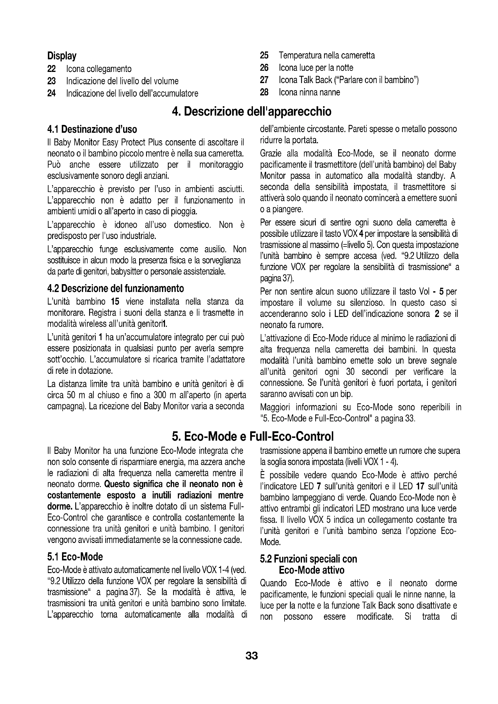 se il neonato fa rumore. L’attivazione di Eco-Mode riduce al minimo le radiazioni di alta frequenza nella cameretta dei bambini. In questa modalità l’unità bambino emette solo un breve segnale all’unità genitori ogni 30 secondi per verificare la connessione. Se l’unità genitori è fuori portata, i genitori saranno avvisati con un bip. Maggiori informazioni su Eco-Mode sono reperibili in "5.Eco-Mode e Full-Eco-Control" a pagina33.