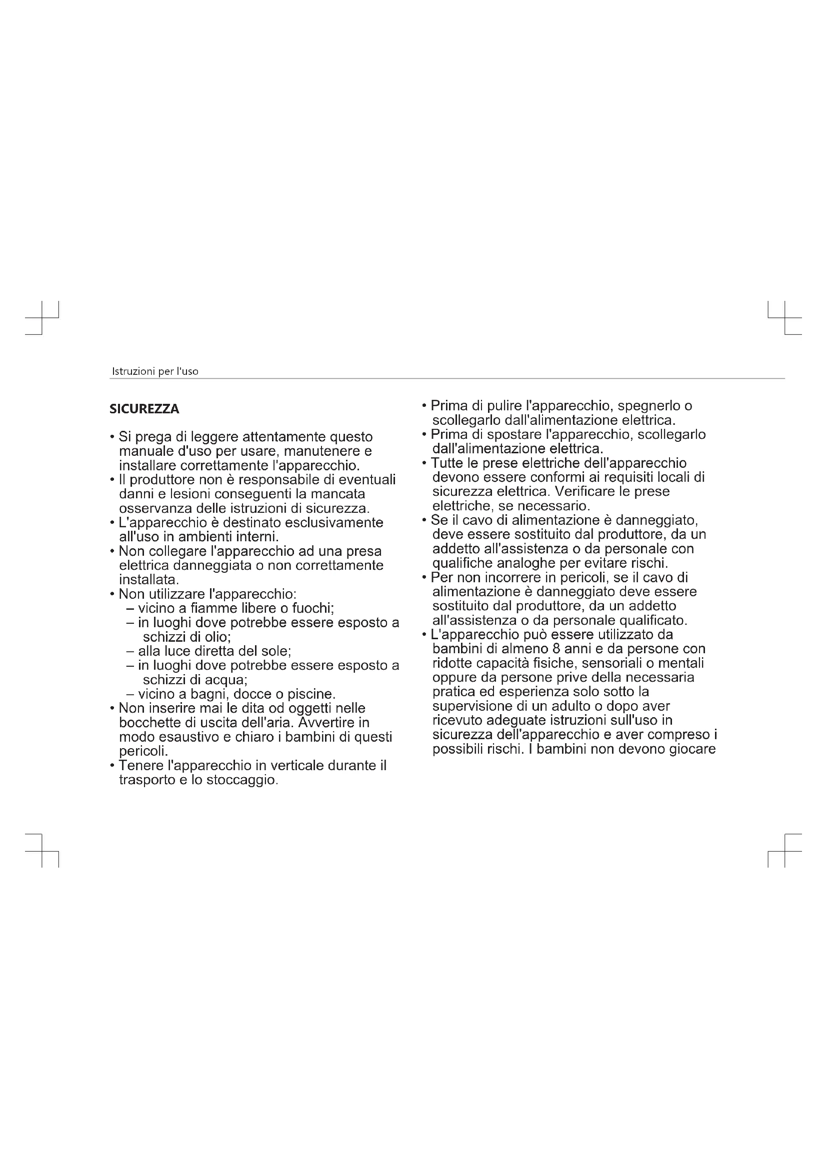 - Non inserire mai le dita od oggetti nelle bocchette di uscita dell'aria. Avvertire in modo esaustivo e chiaro i bambini di questi pericoli.