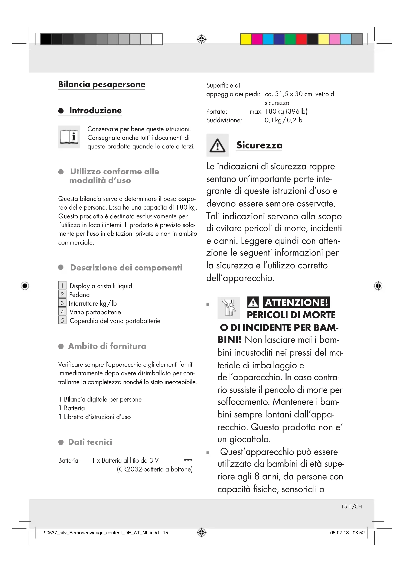 BINI! Non lasciare mai i bam- bini incustoditi nei pressi del ma- teriale di imballaggio e dell’apparecchio. In caso contra- rio sussiste il pericolo di morte per soffocamento. Mantenere i bam- bini sempre lontani dall’appa- recchio. Questo prodotto non e‘ un giocattolo. Quest‘apparecchio può essere utilizzato da bambini di età supe- riore agli 8 anni, da persone con capacità fisiche, sensoriali o 90537_silv_Personenwaage_content_DE_AT_NL.indd 15 05.07.13 08:5216 IT/CH mentali ridotte o da persone inesperte solo se supervisionate o preventivamente istruite sull’uti- lizzo in sicurezza del prodotto e solo se informate dei pericoli legati al prodotto stesso. Non lasciare che i bambini giochino con l‘apparecchio. La pulizia e la manutenzione non devono esse- re eseguite dai bambini senza supervisione. ATTENZIONE! PERICOLO DI LESIONE! Non caricare la bilancia con un peso superiore ai 180 kg. Il vetro di sicurezza potrebbe rompersi e provocare ferite da taglio. ATTENZIONE! PERICOLO DI LESIONE! Non salire sulla bilancia con piedi bagnati e non utilizzare la bilancia quando la superficie di appoggio dei piedi è umida. Sussiste il pericolo di scivolamento. Proteggere la bilancia da colpi, umidità, polvere, agenti chimici, forti oscillazioni di temperatura e da fonti di calore (forni, caloriferi) troppo vicini. Non esporre l’apparecchio - a temperature estreme, - a forti vibrazioni, - a forti sollecitazioni meccaniche, - alla luce solare diretta, - all’umidità. In caso contrario sussiste il rischio di danneggiare l’apparecchio. Controllare l’apparecchio prima di avviarlo per verificare l’even- tuale presenza di danneggia- menti. Non mettere in esercizio un apparecchio danneggiato. In caso di guasti o di apparec- chio difettoso rimuovere la batte- ria. In caso contrario sussiste il rischio di perdite. Non aprire mai l’alloggiamento dell’apparecchio. Lesioni e dan- neggiamenti all’apparecchio po- trebbero essere la conseguenza di tale azione. Fare eseguire ri- parazioni solamente dal Centro assistenza o da un elettricista qualificato. ATTENZIONE! Posare la bilancia al di fuori delle aree di passaggio. In caso contrario si potrebbe inciampare in essa. Pericoli nel maneggia- re le batterie ATTENZIONE! PERICOLO DI MORTE! Le batterie non de- vono finire in mano ai bambini. Non lasciare batterie in giro. Sussiste il pericolo che bambini 90537_silv_Personenwaage_content_DE_AT_NL.indd 16 05.07.13 08:5217 IT/CH o animali domestici le ingoino. In tal caso, chiedere subito l’in- tervento di un medico. ATTENZIONE! PERI-