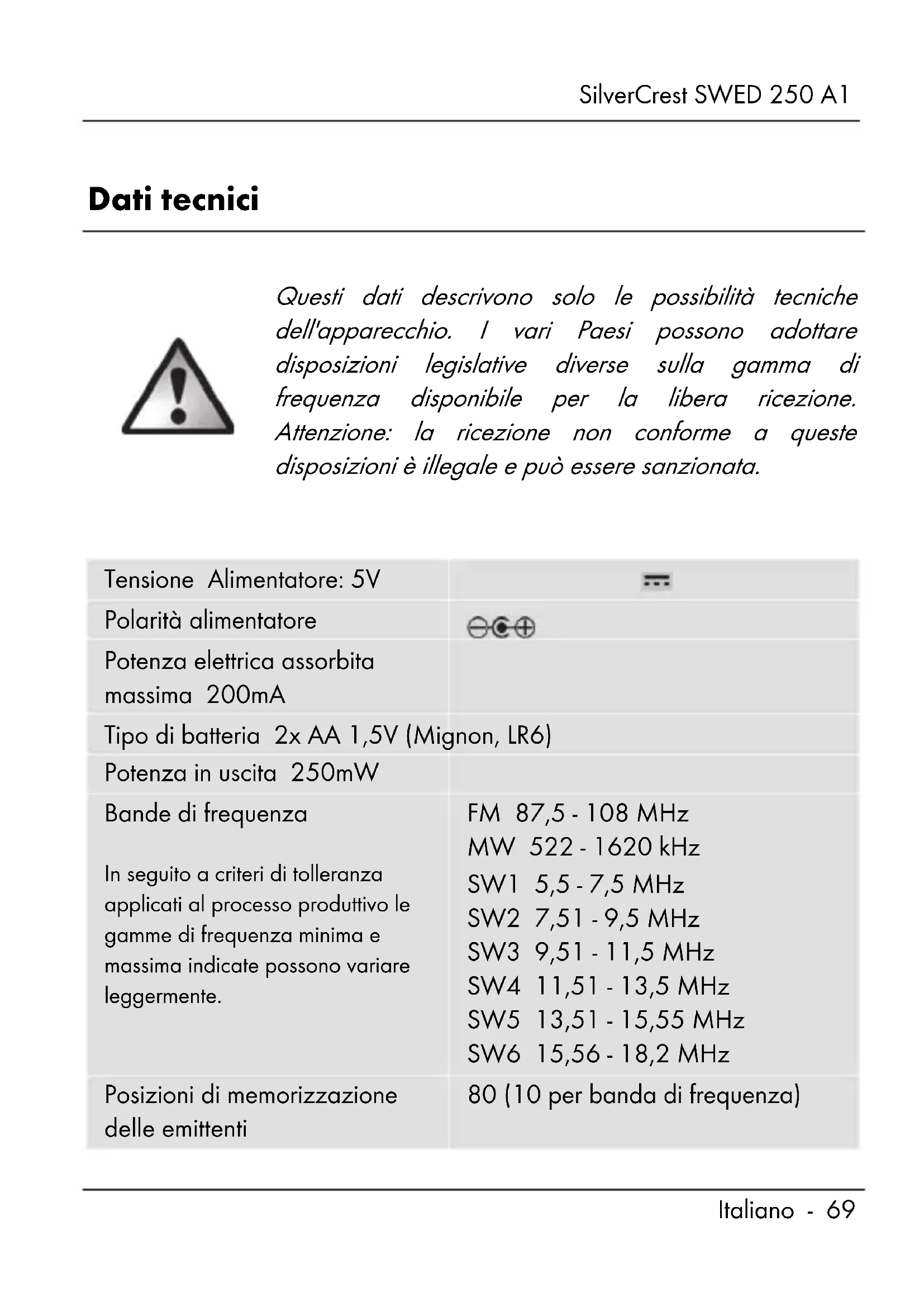ttenzione: la ricezione non conforme a queste disposizioni è illegale e può essere sanzionata. Tensione Alimentatore: 5V Polarità alimentatore Potenza elettrica assorbita massima 200mA Tipo di batteria 2x AA 1,5V (Mignon, LR6) Potenza in uscita 250mW Bande di frequenza In seguito a criteri di tolleranza applicati al processo produttivo le gamme di frequenza minima e massima indicate possono variare leggermente. FM 87,5 - 108 MHz MW 522 - 1620 kHz SW1 5,5 - 7,5 MHz SW2 7,51 - 9,5 MHz SW3 9,51 - 11,5 MHz SW4 11,51 - 13,5 MHz SW5 13,51 - 15,55 MHz SW6 15,56 - 18,2 MHz Posizioni di memorizzazione delle emittenti 80 (10 per banda di frequenza)SilverCrest SWED 250 A1