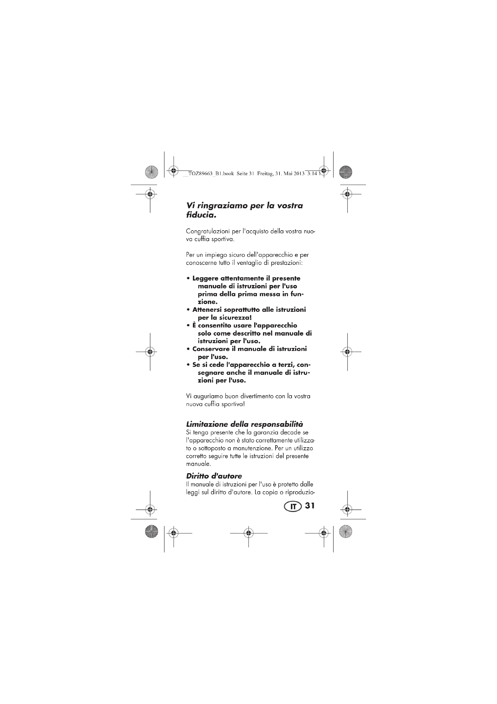 - Se si cede l'apparecchio a terzi, con- segnare anche il manuale di istru- zioni per l'uso. Vi auguriamo buon divertimento con la vostra nuova cuffia sportiva! Limitazione della responsabilità Si tenga presente che la garanzia decade se l'apparecchio non è stato correttamente utilizza- to o sottoposto a manutenzione. Per un utilizzo corretto seguire tutte le istruzioni del presente manuale. Diritto d'autore Il manuale di istruzioni per l'uso è protetto dalle leggi sul diritto d'autore. La copia o riproduzio- __TOZ89663_B1.book Seite 31 Freitag, 31. Mai 2013 3:14 1532